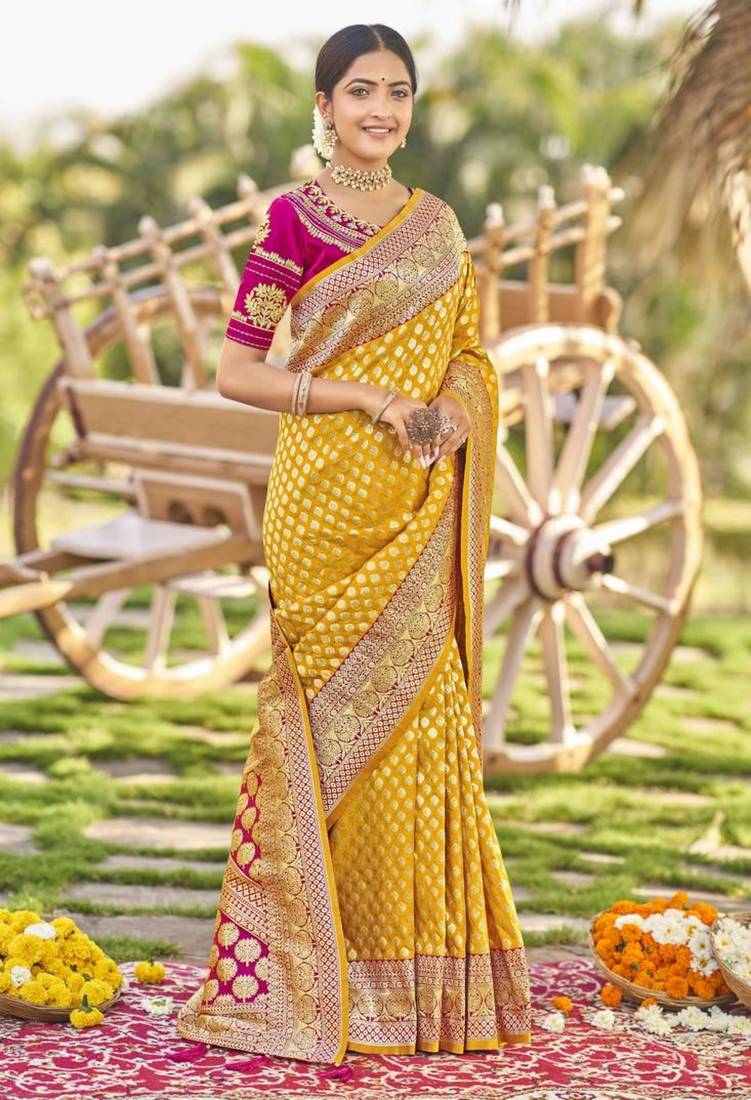 Mustard yellow banarasi silk blend saree