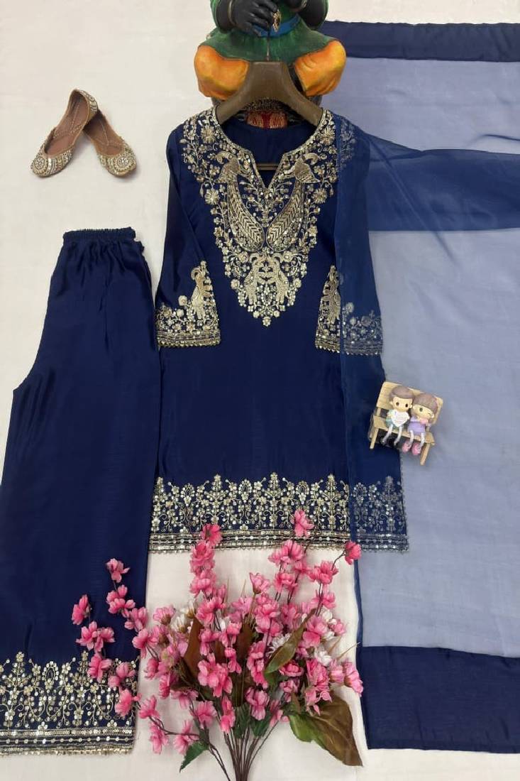 | Product Description | A Stunning Navy Blue Kurta Set Adorned With Intricate Gold Embroidery Across The Neckline And Hem. Paired With Matching Palazzo Pants And A Sheer Dupatta, This Festive Outfit Radiates Sophistication. Ideal For Weddings, Festive Gatherings, And Evening Celebrations. |
