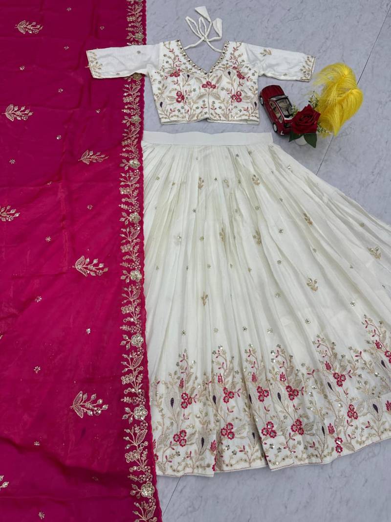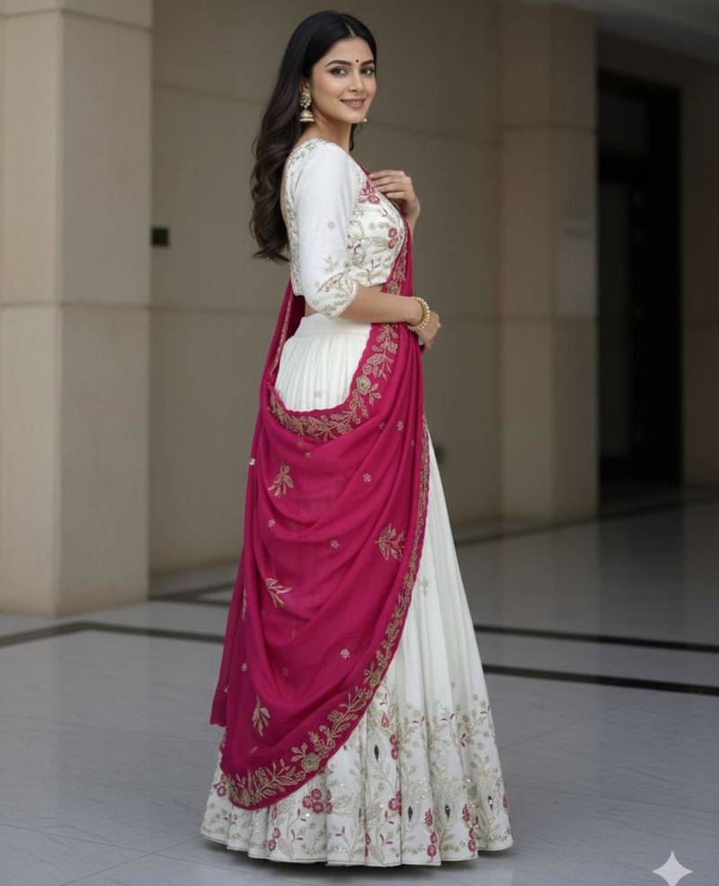 | Product Description | This Off White Lehenga Set Features A Beautifully Embroidered Blouse And A Vibrant Pink Dupatta With Detailed Border Work. Made From Lightweight, High Quality Fabric, It Ensures Comfort And Elegance. Perfect For Festive Gatherings And Special Occasions, This Outfit Highlights Subtle Tones With A Bright, Stylish Contrast. |