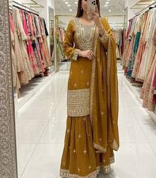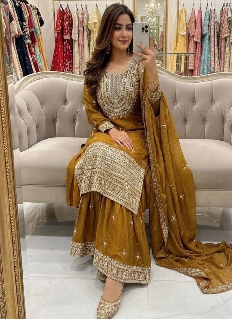 Mustard embroidered suit set stitched