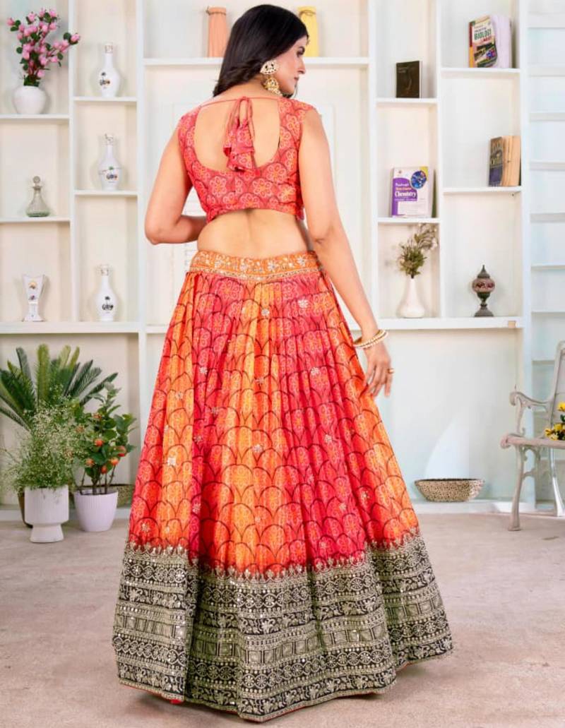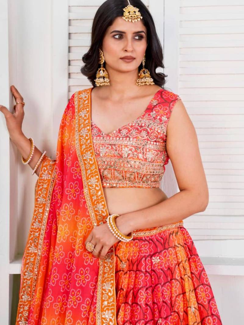 This Vibrant Orange Lehenga Set Features A Printed Blouse And Skirt With Detailed Border Work. Designed With Lightweight Fabric, It Ensures Comfort And Ease Of Movement. Perfect For Festive Celebrations And Cultural Events, This Outfit Offers A Lively Color Palette With Traditional Design Elements.