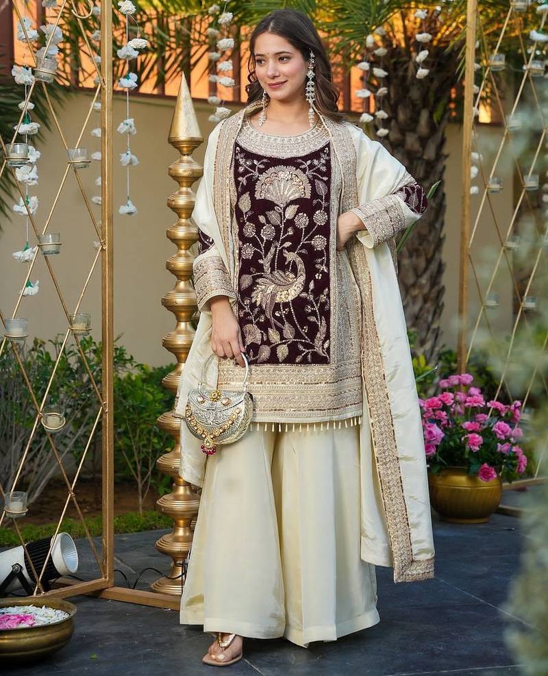 | Product Description | Experience The Richness Of Velvet With This Exquisite Cream And Maroon Ensemble. The Deep Wine Organza Tunic Features Gold Metallic Embroidery, Providing A Striking Contrast Against The Cream Silk Palazzo Pants And Dupatta. This Regal Outfit Is A Masterpiece Of Texture And Color, Perfect For Sophisticated Evening Soirées. |