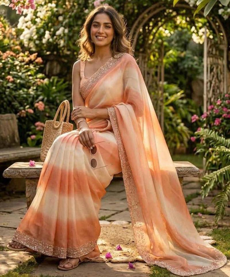 Chic Peach Tie Dye Saree Featuring Soft Color Transitions And A Subtle Embellished Border. Lightweight And Stylish, It Is Perfect For Casual Outings, Festive Brunches, Or Summer Events. This Saree Offers A Blend Of Comfort And Modern Aesthetics For Effortless Everyday Elegance.