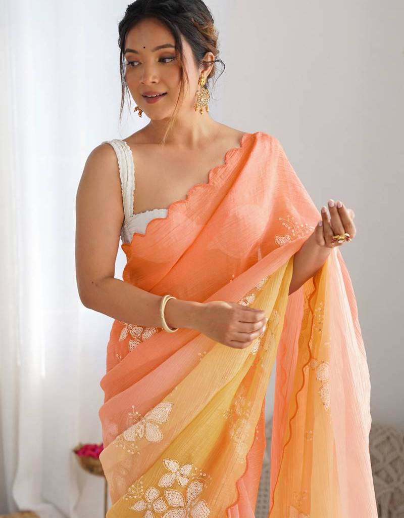 | Product Description | Elevate Your Festive Wardrobe With This Stunning Peach And Yellow Ombre Georgette Saree. Featuring Delicate White Floral Embroidery And A Contemporary Scalloped Border, This Lightweight Drape Offers A Graceful Silhouette. Perfect For Summer Weddings Or Daytime Celebrations, It Pairs Beautifully With A Minimalist White Blouse For A Fresh, Sophisticated Look. |