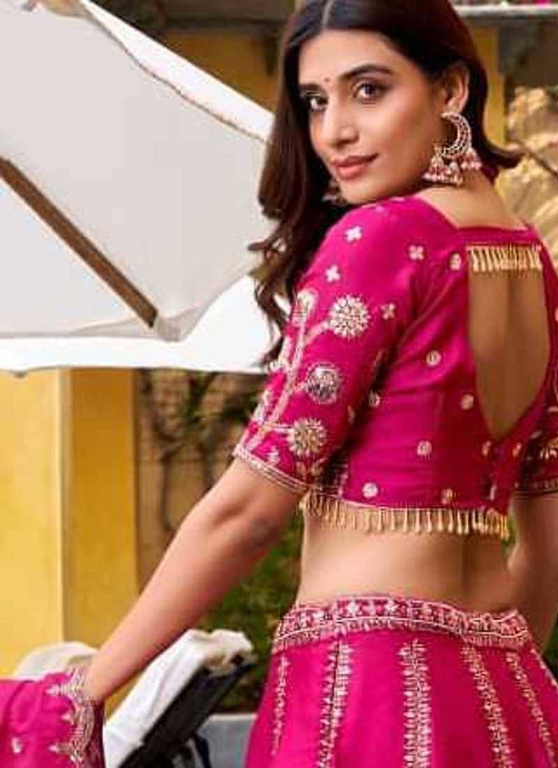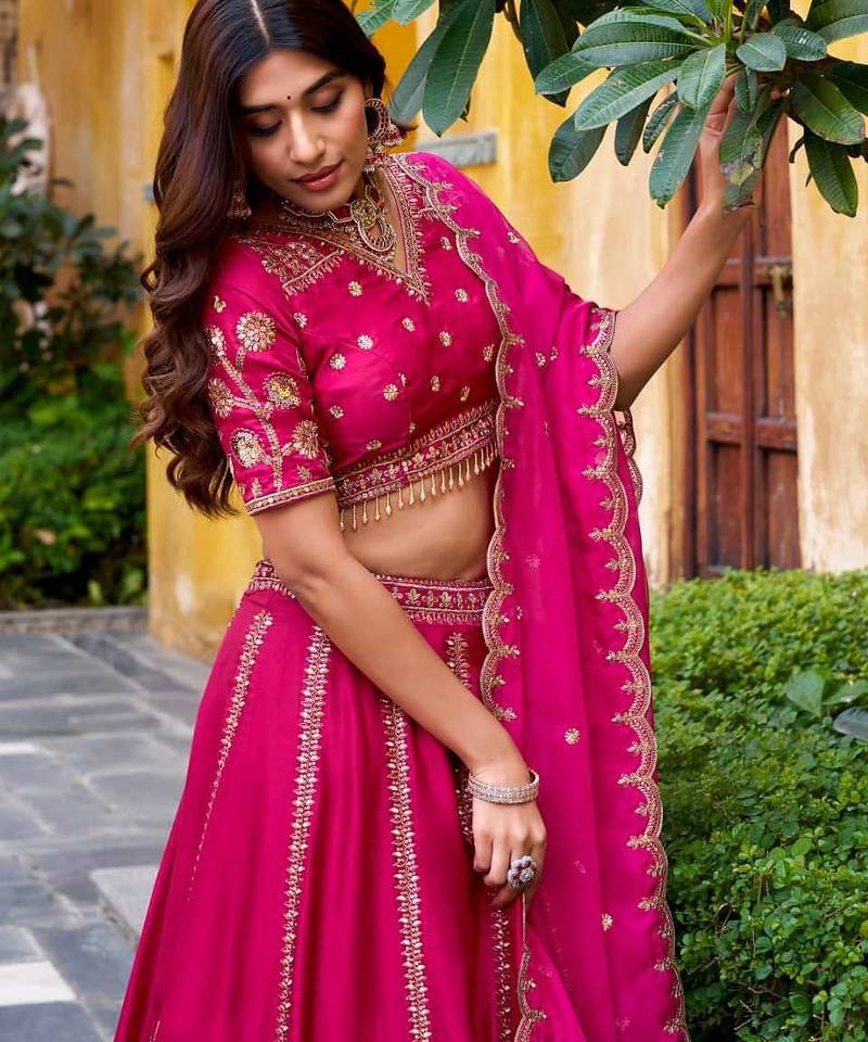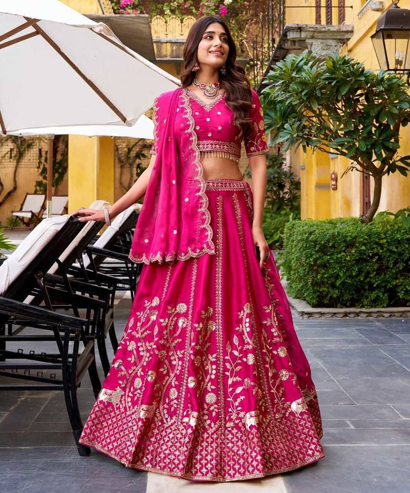 | Product Description | Stunning Hot Pink Bridal Lehenga Decorated With Intricate Golden Embroidery And Rich Detailing. The Stylish Blouse And Matching Dupatta Complete The Glamorous Look. Perfect For Weddings, Receptions, And Grand Festive Events Where Vibrant Color And Luxurious Design Create A Statement. |