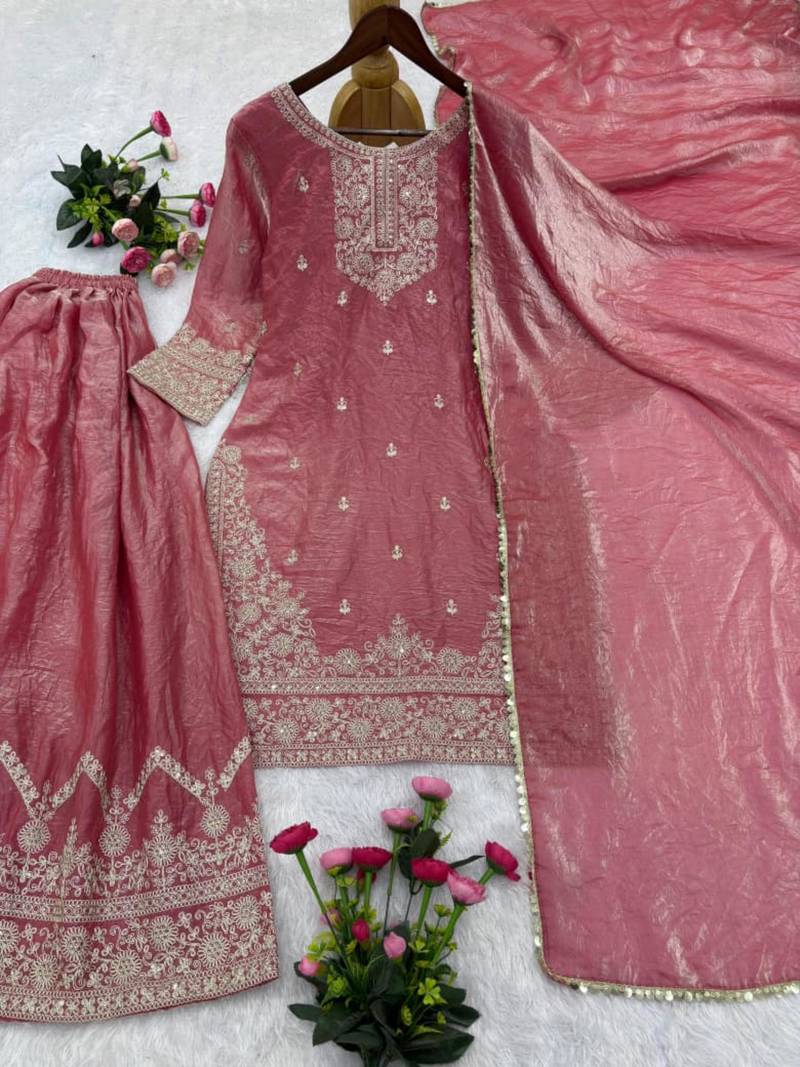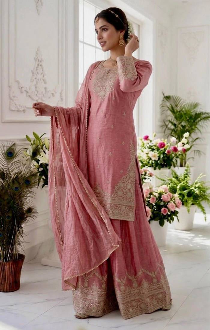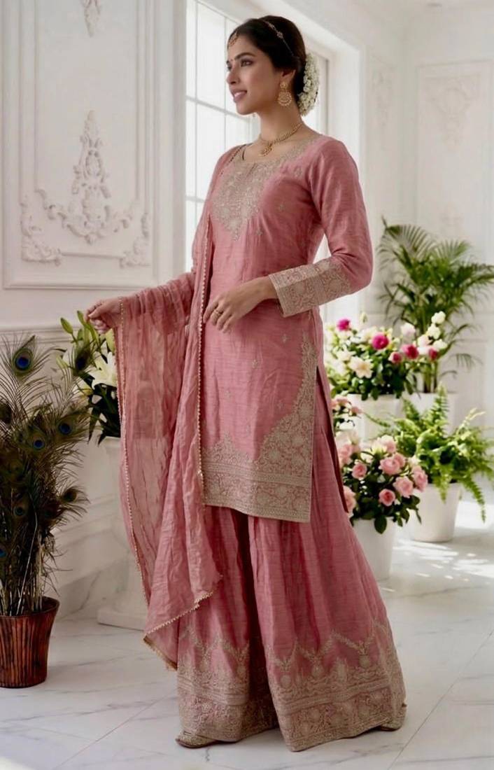 | Product Description | Radiate Charm In This Pink Sharara Set Designed With Fine Gold Embroidery And A Flattering Silhouette. The Kurta, Sharara Pants, And Dupatta Create A Cohesive, Elegant Look. Lightweight And Breathable, It Is Perfect For Daytime Celebrations, Festive Occasions, And Wedding Events With A Soft, Graceful Feel. |