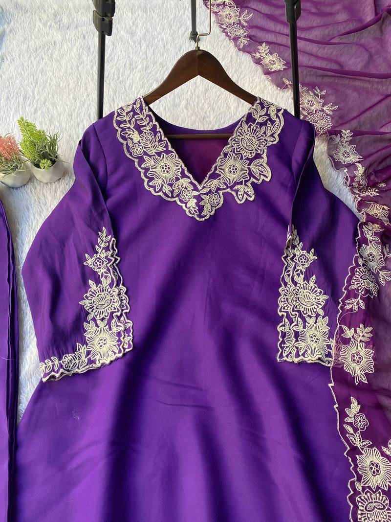 This Royal Purple Kurta Set Features Beautiful Floral Embroidery On The Neckline And Sleeves. Designed For Comfort And Elegance, It Pairs Perfectly With A Matching Dupatta For Festive Occasions.