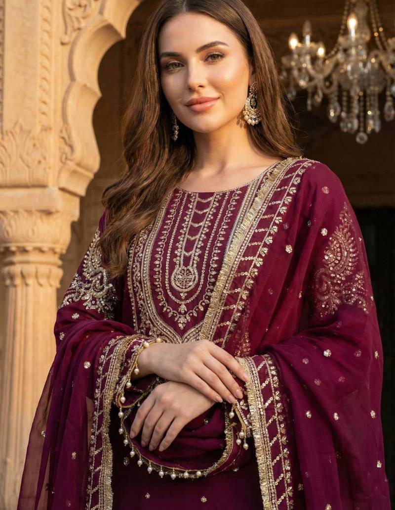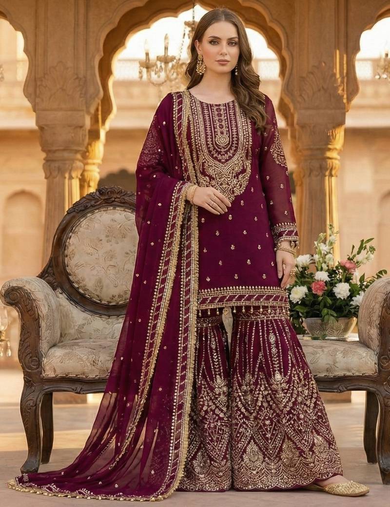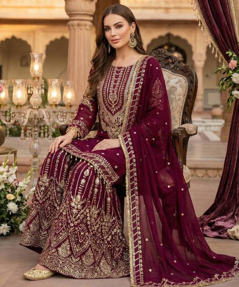 | Product Description | Make A Regal Statement With This Maroon Georgette Stitched Suit Adorned With Intricate Embroidery And Shimmering Sequin Work. Crafted From Premium Georgette Fabric, The Straight Cut Kurta Features Detailed Zari And Sequin Embellishments Along The Neckline, Sleeves, And Hemline For A Rich Festive Finish. The Heavily Embroidered Sharara Adds Graceful Volume And Traditional Charm, Creating A Stunning Silhouette For Special Occasions. |