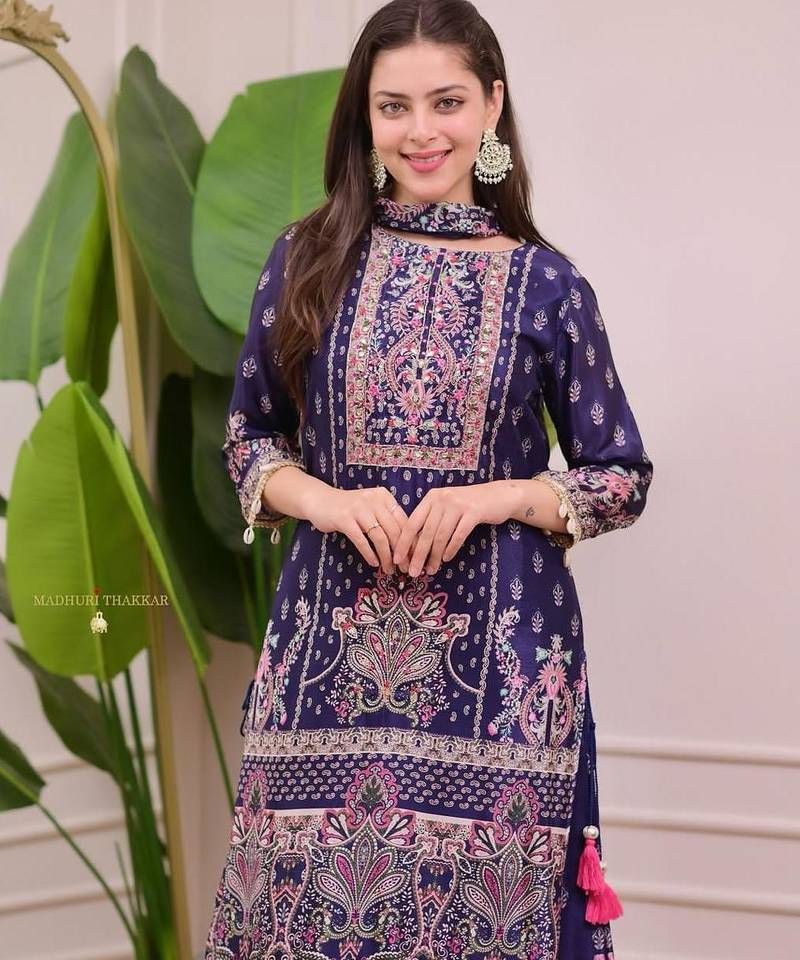 | Product Description | This Purple Silk Kurti Showcases A Rich Blend Of Traditional Prints And Contemporary Design. Featuring Intricate Embroidery On The Yoke And Playful Pink Tassels, It Is Paired With Stylish Wide Leg Bottoms. This Versatile Outfit Is Perfect For Evening Soirées, Offering A Vibrant Color Palette And A Flattering Fit. |