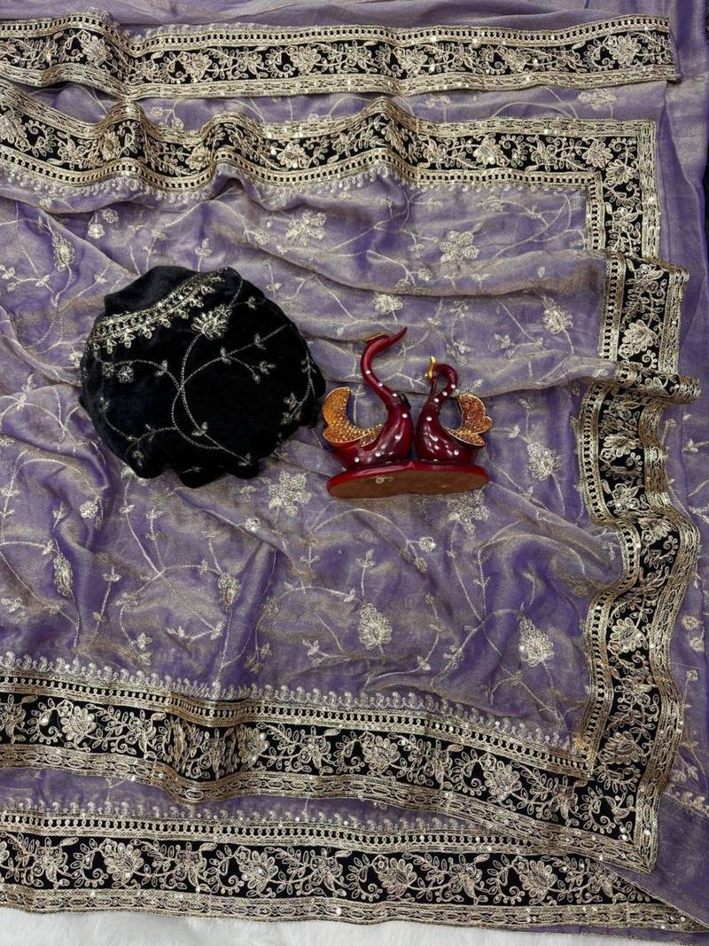 | Product Description | Shine Bright In This Purple Georgette Saree, Adorned With A Heavy Black And Silver Mirror Work Border. The Sheer Fabric Is Sprinkled With Delicate Floral Motifs. Paired With A Matching Black Velvet Silk Blend Blouse, This Look Is The Epitome Of Evening Glamour, Perfect For Receptions And Cocktail Parties. |