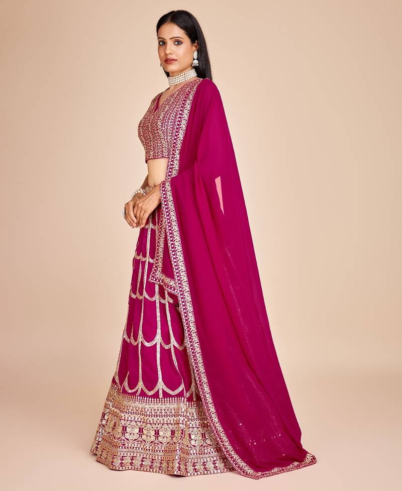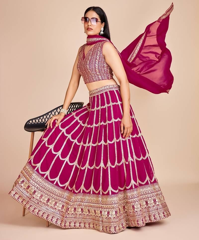 | Product Description | Vibrant Magenta Lehenga Featuring Bold Golden Embroidery And Artistic Border Designs. The Stylish Blouse And Matching Dupatta Create A Glamorous Festive Ensemble. Perfect For Wedding Celebrations, Receptions, And Festive Gatherings. |