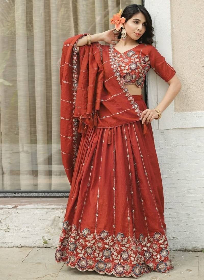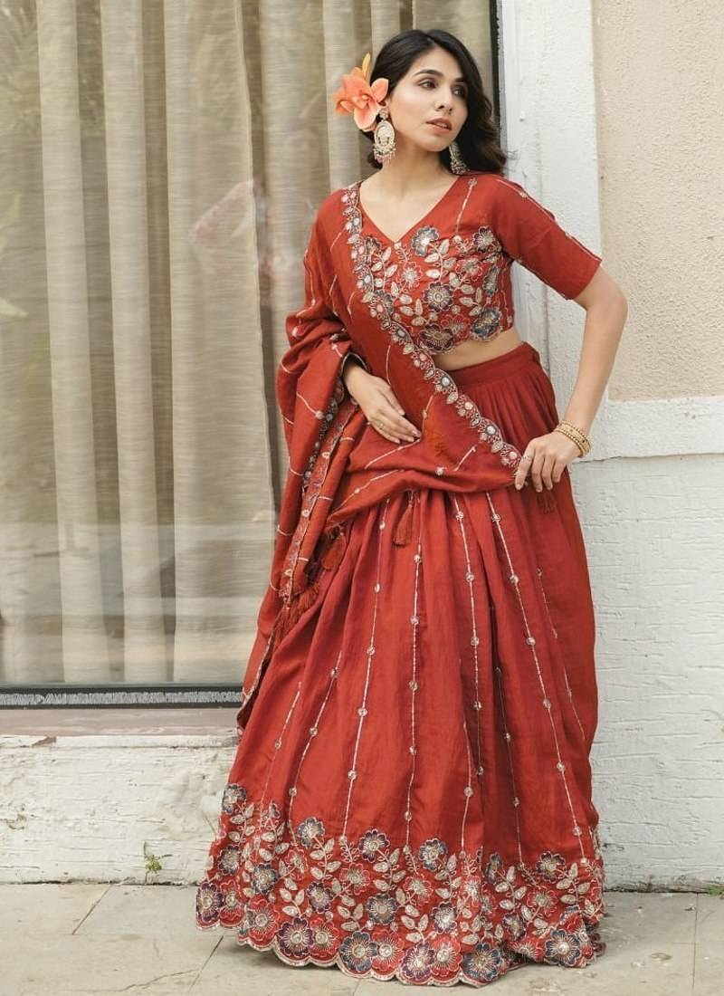 Elegant Red Bridal Lehenga Decorated With Shimmering Embroidery And Delicate Sequin Work. The Stylish Blouse And Sheer Dupatta Create A Glamorous Festive Outfit. Perfect For Wedding Ceremonies, Receptions, And Grand Celebrations Where Traditional Bridal Elegance Shines.