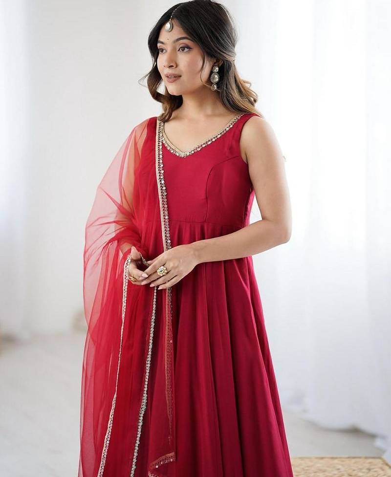 | Product Description | Captivate The Room In This Deep Red Anarkali Suit. Designed For Timeless Appeal, The Bodice Is Detailed With Intricate Silver Embroidery Along The Neckline. The Set Is Completed With A Soft, Ethereal Dupatta And Coordinated Trousers, Striking The Perfect Balance Between Traditional Charm And Modern Minimalist Luxury For Festive Wear. |