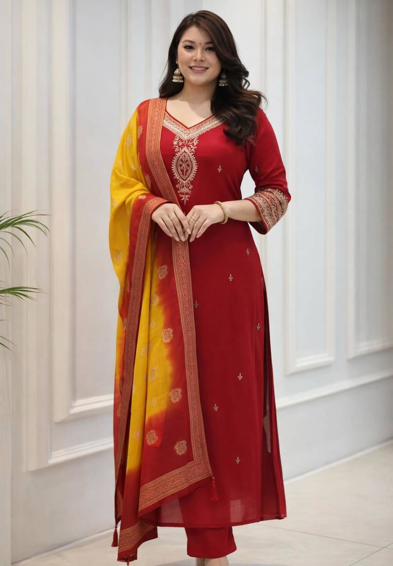 | Product Description | Make A Bold Statement In This Vibrant Red Silk Blend Salwar Kameez. The Straight Cut Kurta Is Detailed With Delicate Golden Embroidery And Traditional Motifs. A Stunning Contrast Amber And Red Ombre Dupatta Adds A Dynamic Touch, Making This The Perfect Attire For Weddings And High Profile Cultural Celebrations. |