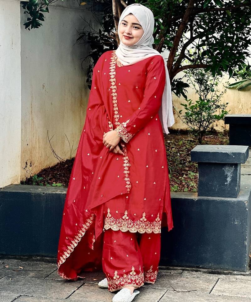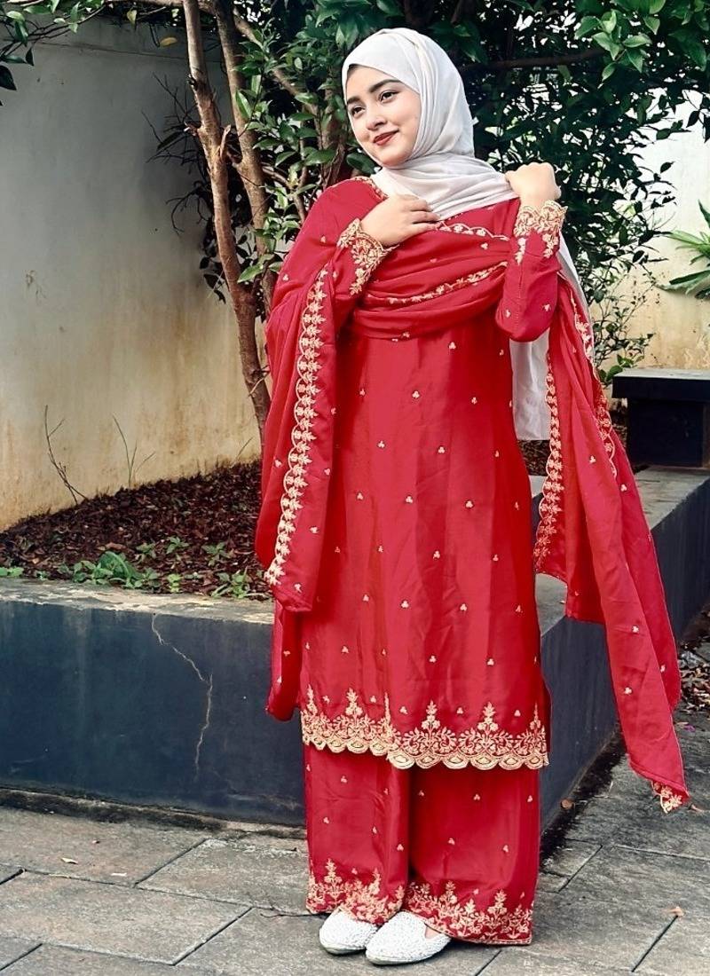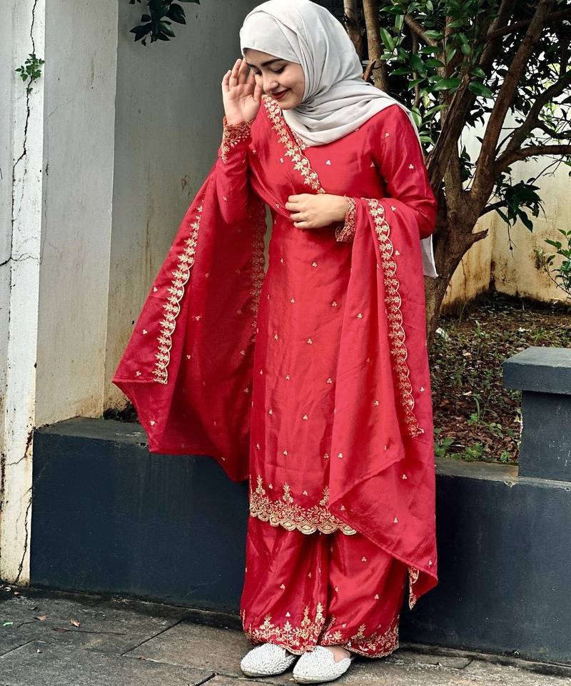 | Product Description | Elevate Your Ethnic Wardrobe With This Sophisticated Red Silk Suit. The Ensemble Features Exquisite Gold Threadwork Along The Borders And Neckline, Complemented By A Matching Dupatta With Scalloped Edges. Perfect For Formal Gatherings, This Outfit Offers A Refined, Modest Aesthetic That Ensures You Stand Out With Timeless Poise. |