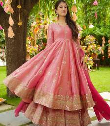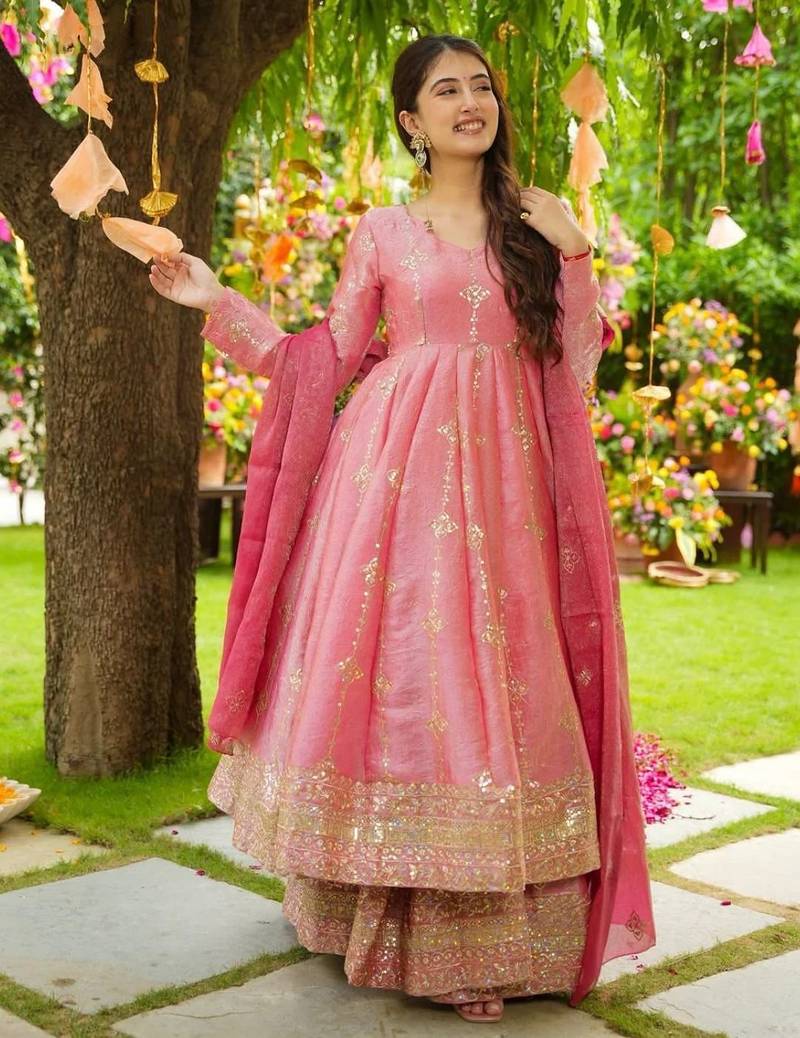 Royal blush pink silk anarkali set with intricate gold zari work stitched