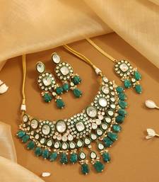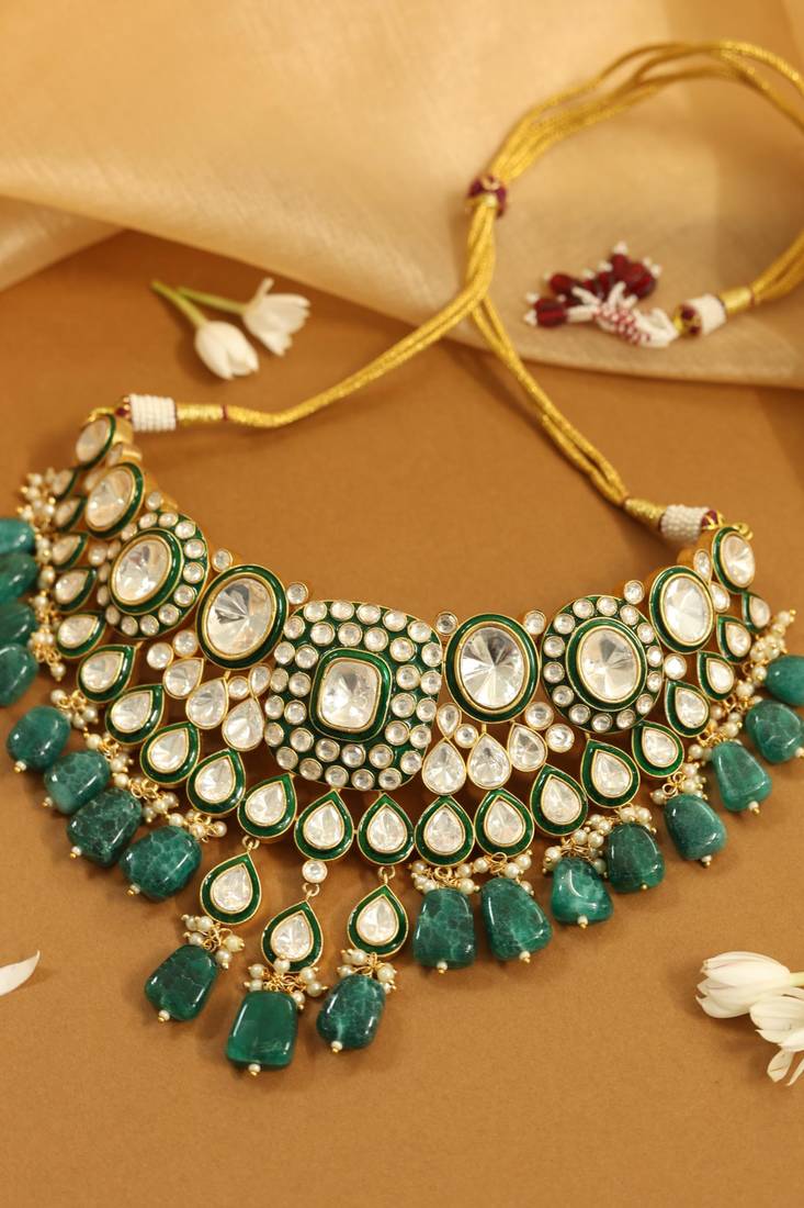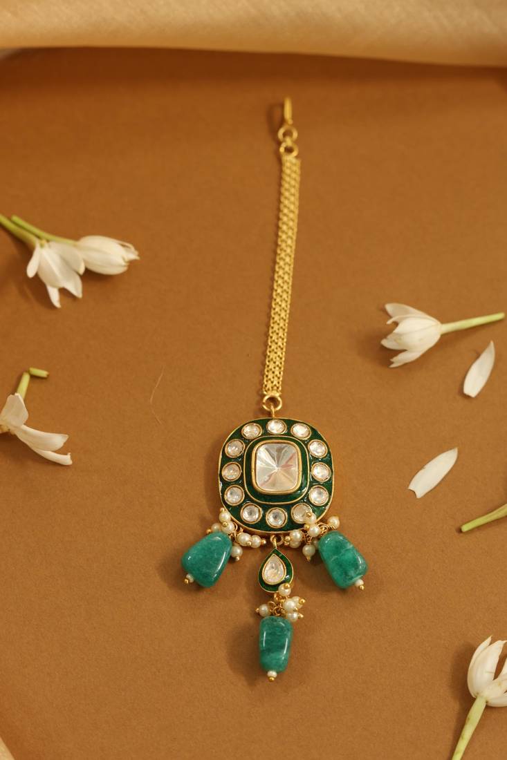 | Product Description | This Opulent Necklace Set Showcases Rich Green Onyx Style Stones Paired With Classic Kundan Settings. The Teardrop Motifs And Textured Beads Create A Voluminous, High Fashion Look That Commands Attention. Complete With Matching Earrings And A Maang Tikka, This Ensemble Is Perfect For Adding A Touch Of Emerald Elegance To Any Attire. |