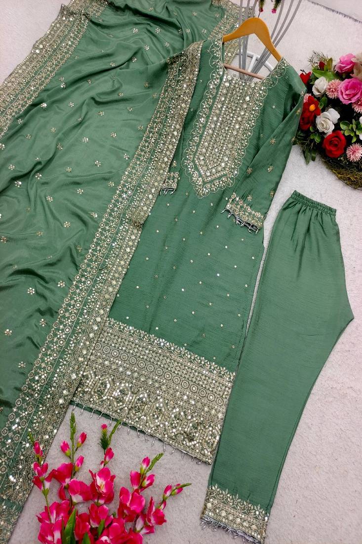 Sage green embroidered straight suit set stitched
