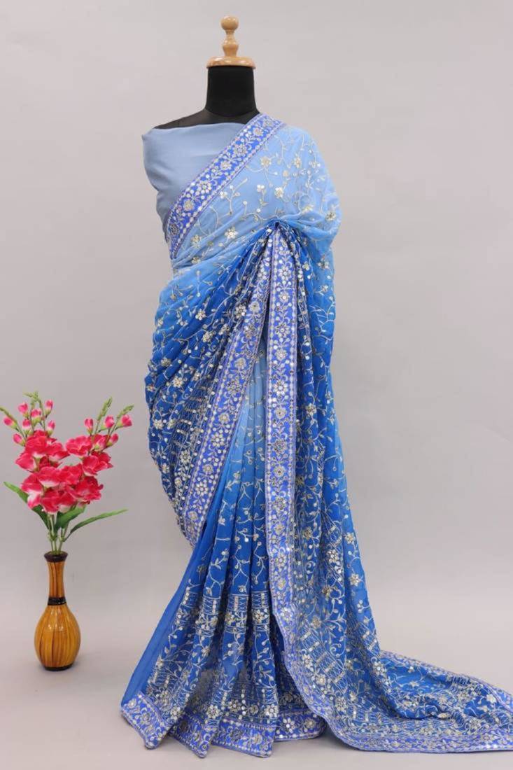 | Product Description | Experience Ethereal Grace With This Blue Ombre Saree, Transitioning From Powder Blue To Deep Azure. The Sheer Fabric Is Adorned With Delicate Floral Thread Embroidery And Shimmering Mirror Work Borders. This Refreshing Design Captures A Romantic Aesthetic, Making It A Splendid Choice For Summer Weddings And Sophisticated Daytime Gatherings. |