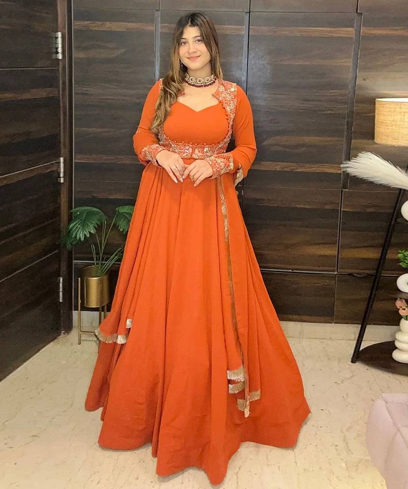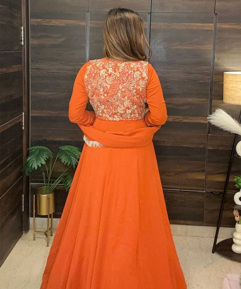 | Product Description | Make A Bold Statement With This Tangerine Georgette Anarkali Gown. The Bodice Is Adorned With Vibrant Floral Appliqué And Mirror Work, Blending Traditional Techniques With Modern Individuality. Designed For A Royal Silhouette, This Floor Length Piece Is Ideal For Sangeet Ceremonies And High End Global Evening Events. |