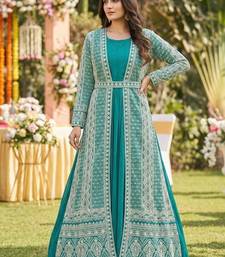 | Product Description | Experience Fusion Fashion At Its Finest With This Teal Blue Jacket Style Gown. The Inner Solid Tone Floor Length Dress Is Layered With A Stunning Full Sleeved Jacket Featuring All Over White Thread Work And A Belted Waist. This Versatile Ensemble Provides A Slim Fit Look And A Sophisticated Silhouette, Perfect For Grand Receptions And Cultural Festivals. |
