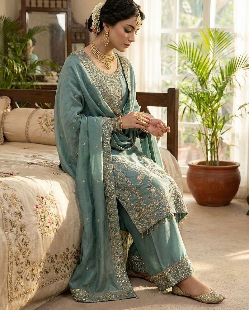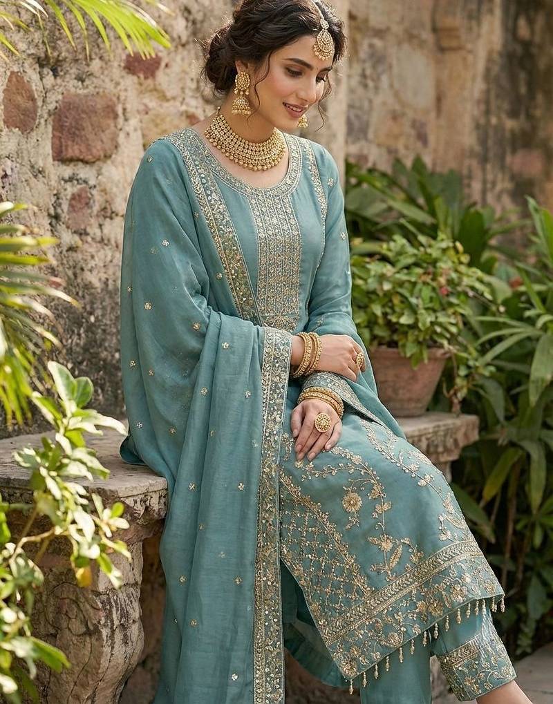 Teal blue gold thread embroidered palazzo suit stitched