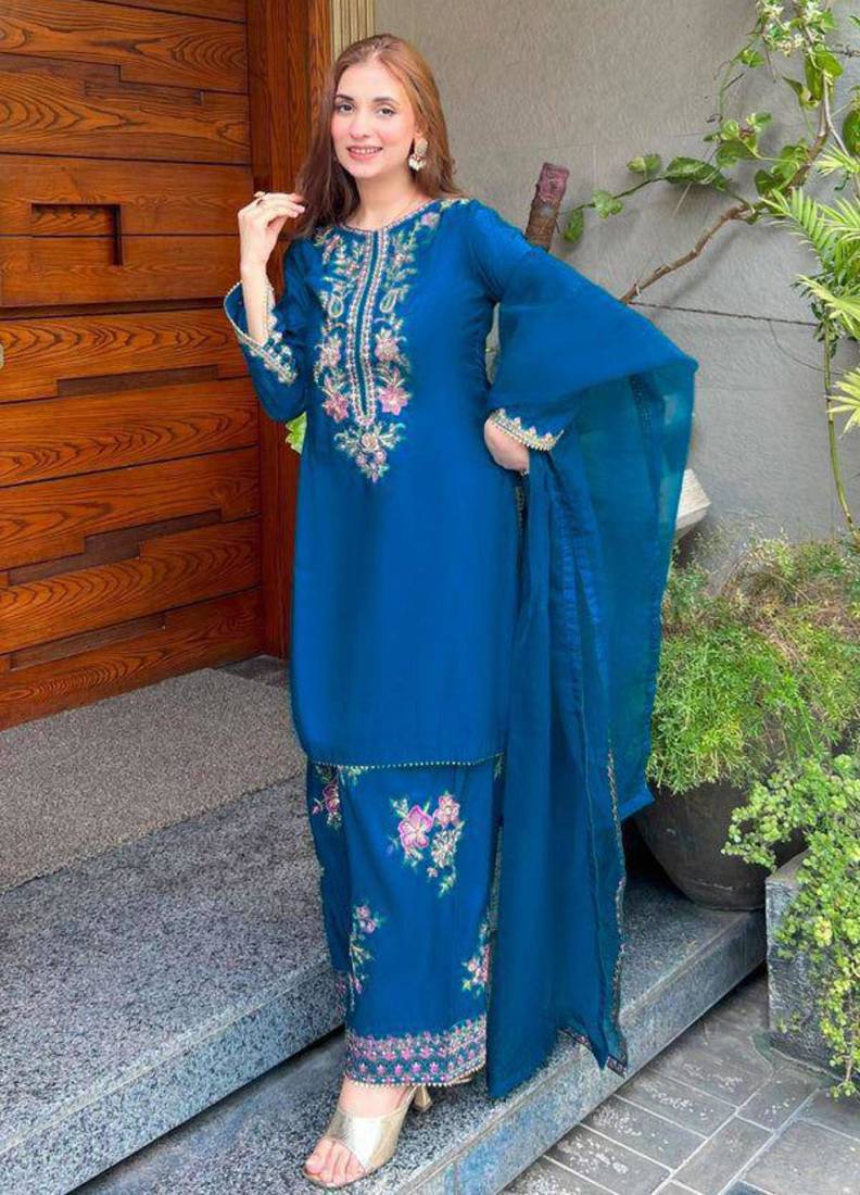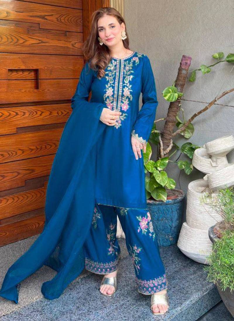 Stand Out In This Vibrant Teal Suit. Crafted From A Premium Silk Blend, The Tunic Features Intricate Pink And Gold Floral Embroidery Along The Neckline And Hem. Paired With Matching Wide Leg Palazzo Pants And A Sheer Dupatta, This Ensemble Offers A Colorful Yet Sophisticated Look For Festive Parties.