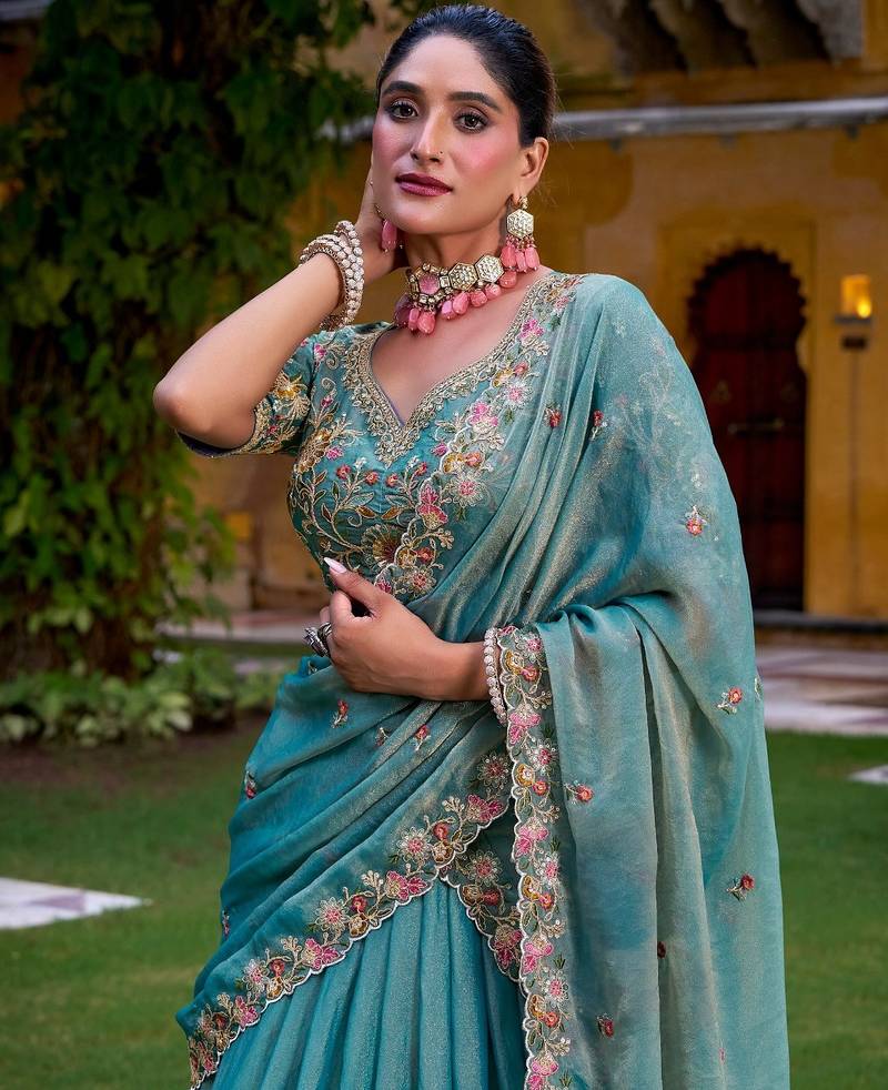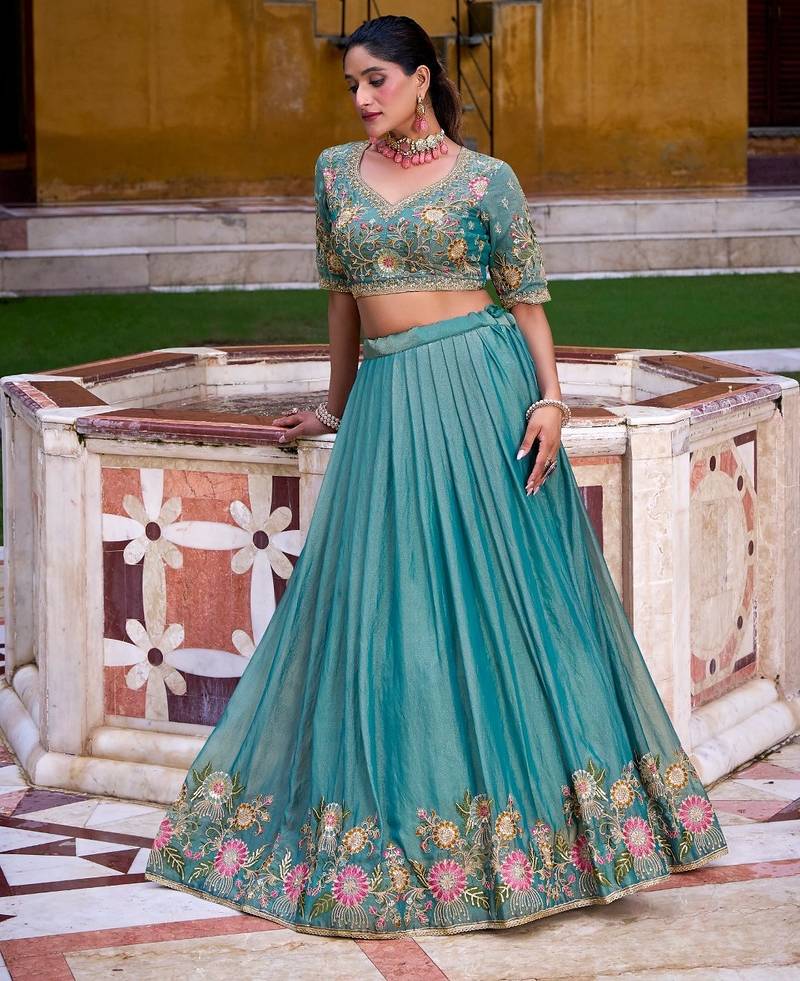 | Product Description | This Teal Lehenga Is A Breath Of Fresh Air For Any Festive Occasion. The Blouse Is Heavily Embellished With Multi Colored Floral Threadwork, While The Pleated Skirt Features Delicate Embroidery At The Base. Lightweight Yet Opulent, It’s Designed For The Modern Woman Who Values Comfort Without Compromising On Style. |