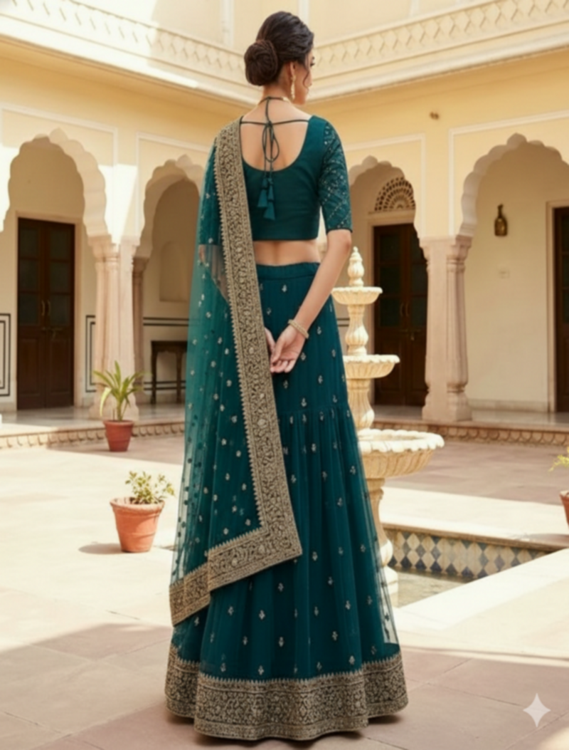 | Product Description | This Teal Green Lehenga Set Features A Half Sleeve Blouse, Flared Skirt, And Sheer Dupatta Adorned With Fine Gold Embroidery. Crafted For Comfort And Elegance, It Offers A Regal Look. Perfect For Weddings, Traditional Ceremonies, And Formal Celebrations With Timeless Ethnic Charm. |