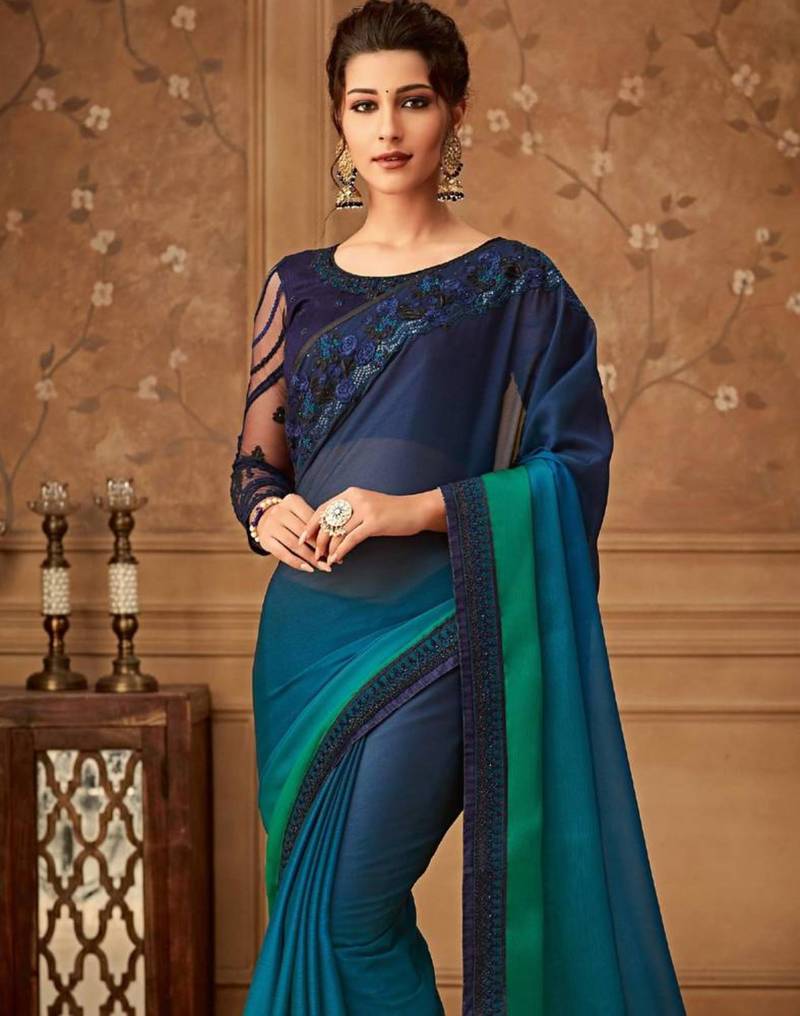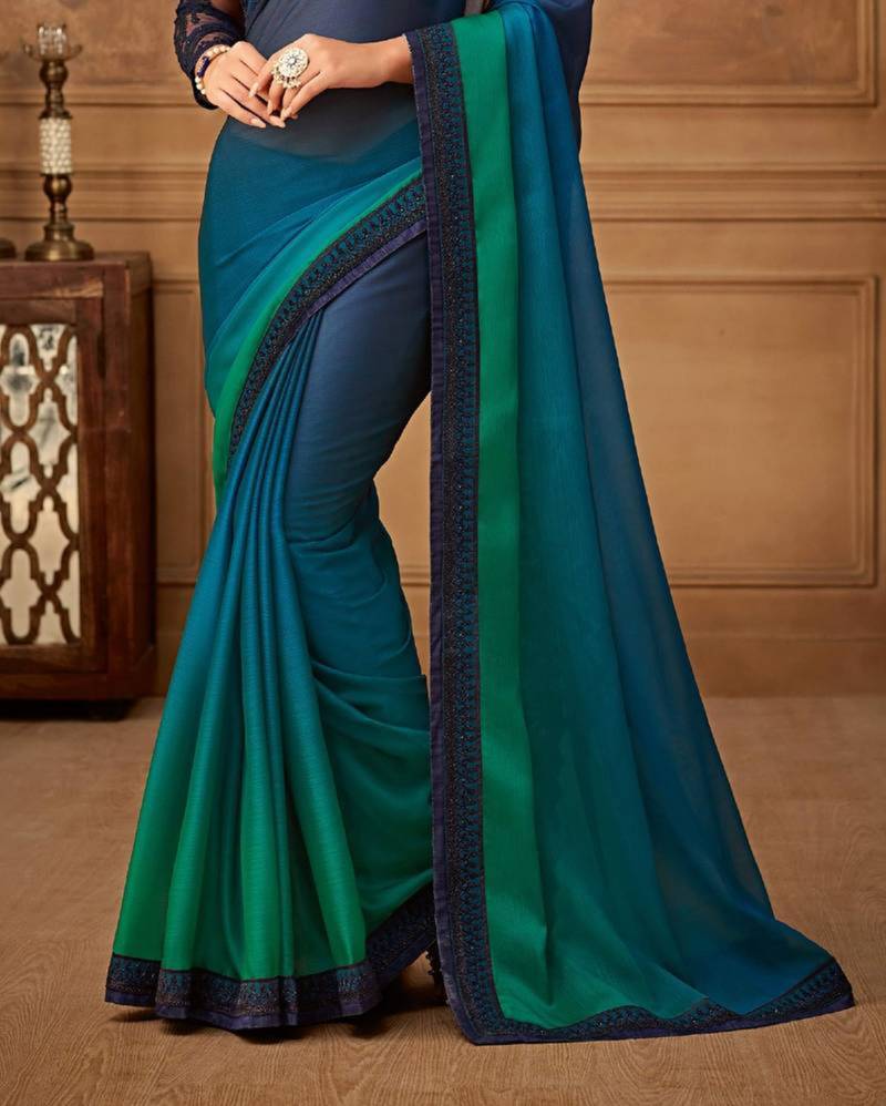 Teal & navy dual-tone chiffon saree