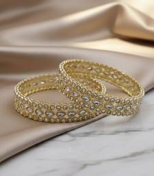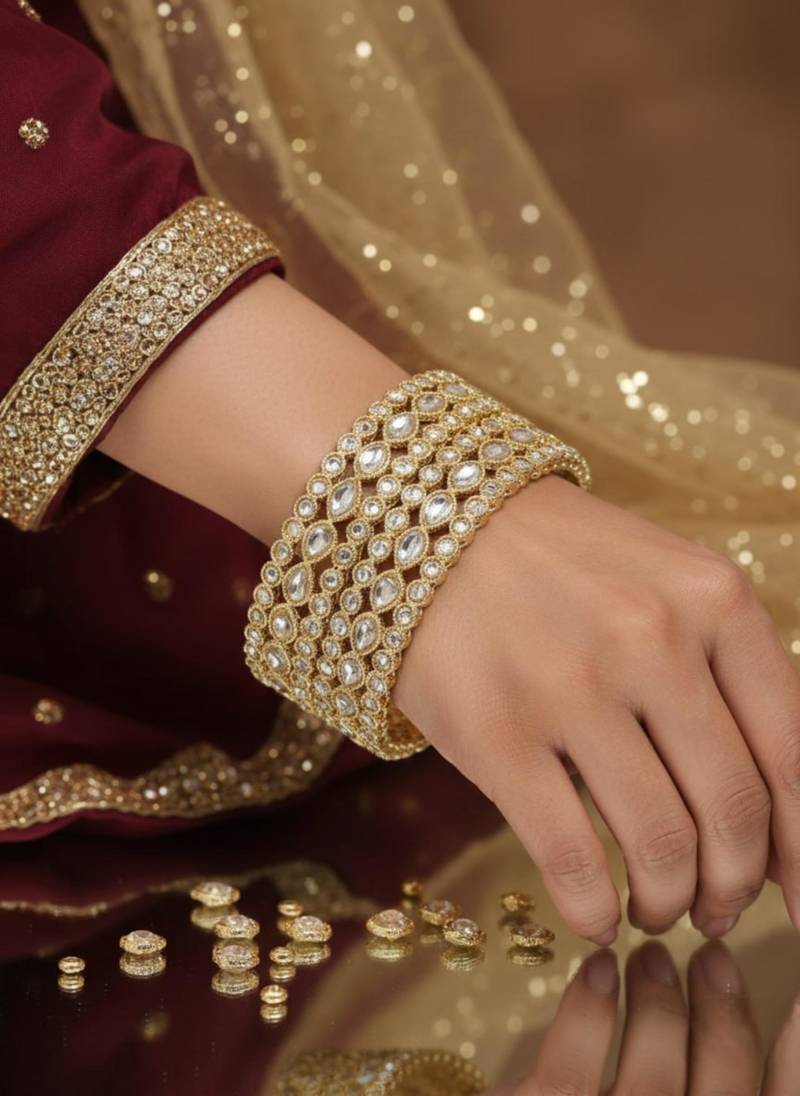 | Product Description | Enhance Your Ethnic Ensemble With These Exquisite Gold Plated Bangles, Featuring A Unique Scalloped Silhouette. Adorned With Precision Cut Kundan Stones And Delicate Beadwork, These Handcrafted Pieces Blend Traditional Artistry With Modern Flair. Perfect For Weddings Or Festive Celebrations, They Offer A Regal Touch To Any Sophisticated Jewelry Collection. |