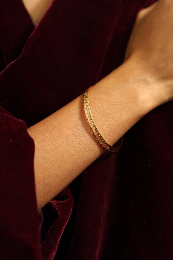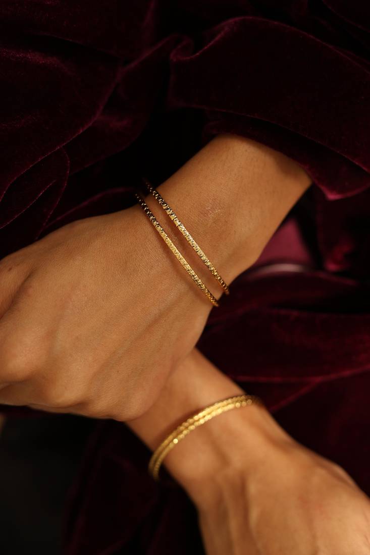 | Product Description | Add Texture To Your Wrist With This Set Of Textured Gold Stacking Bangles. These Slender Bands Feature A Finely Etched Pattern That Reflects Light Beautifully With Every Movement. Durable And Versatile, They Are Designed For The Woman Who Appreciates Subtle Craftsmanship And The Effortless Elegance Of Layered Gold Jewelry. |