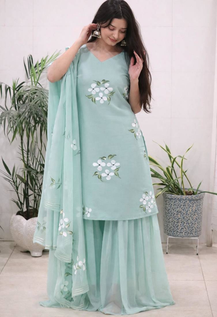 | Product Description | This Turquoise Sharara Set Features Soft Floral Prints With A Flowing Dupatta And Flared Silhouette. Designed For Comfort And Elegance, It Is Ideal For Daytime Events And Festive Occasions. The Lightweight Fabric And Modern Design Create A Refreshing, Stylish Ethnic Outfit For Any Wardrobe. |