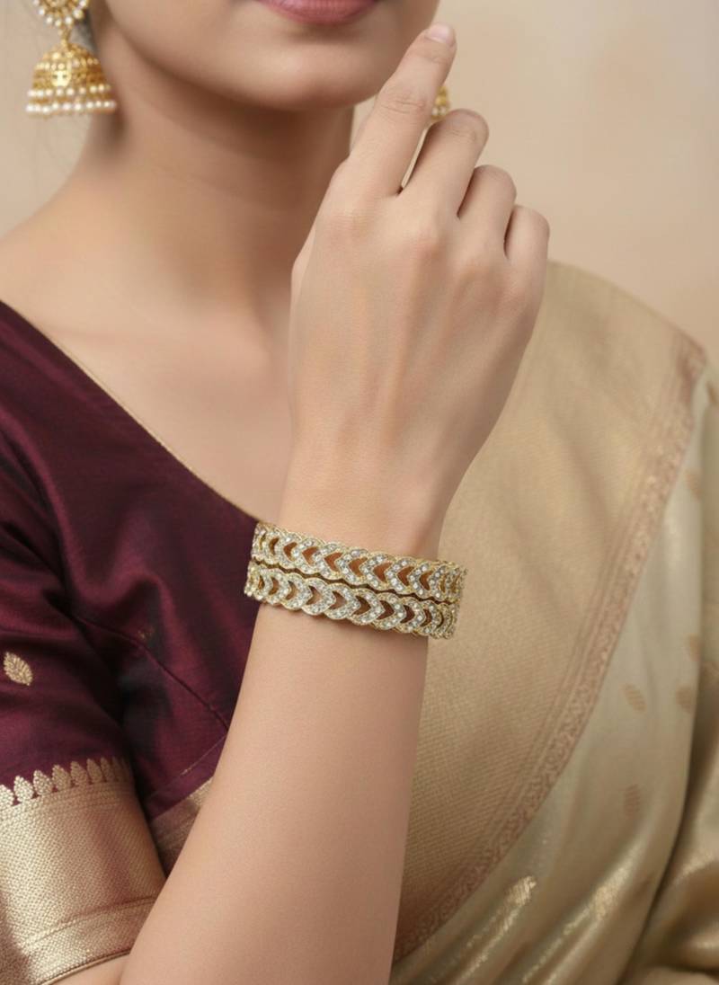 | Product Description | Enhance Your Ethnic Ensemble With These Exquisite Gold Plated Bangles, Featuring A Unique Scalloped Silhouette. Adorned With Precision Cut Kundan Stones And Delicate Beadwork, These Handcrafted Pieces Blend Traditional Artistry With Modern Flair. Perfect For Weddings Or Festive Celebrations, They Offer A Regal Touch To Any Sophisticated Jewelry Collection. |