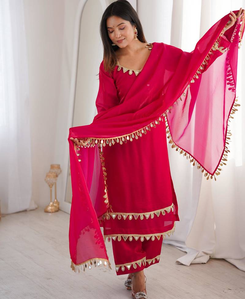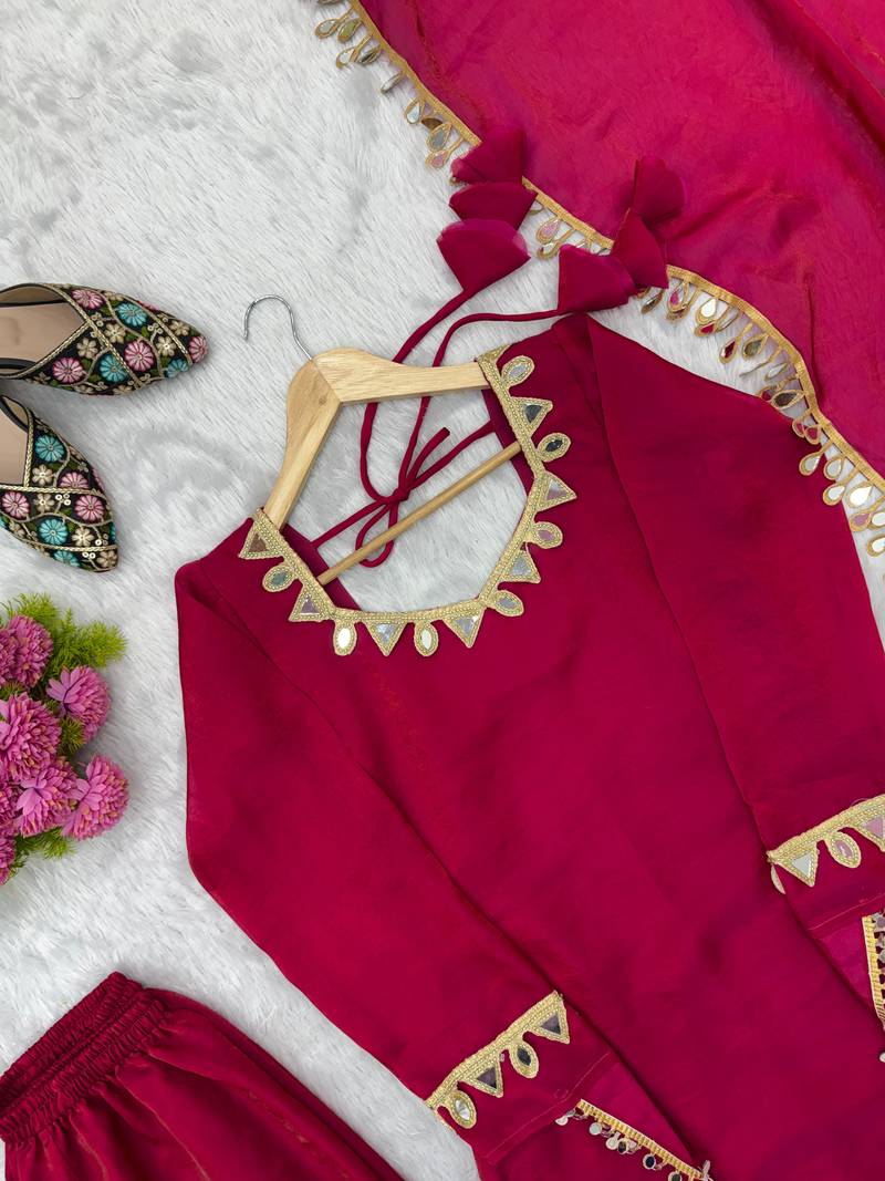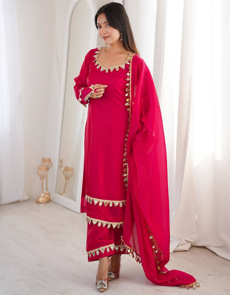 Vibrant fuchsia pink crepe salwar suit with mirror work accents stitched