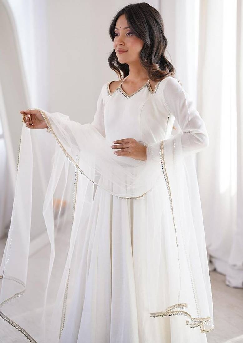 | Product Description | Stylish White Anarkali Dress Designed With A Flowing Silhouette And Elegant Neckline Detailing. The Lightweight Fabric Offers Comfort While The Matching Dupatta Adds Graceful Movement. Ideal For Festive Gatherings, Weddings, And Special Occasions. This Timeless Ethnic Outfit Combines Modern Elegance With Traditional Charm For A Refined, Feminine Look. |