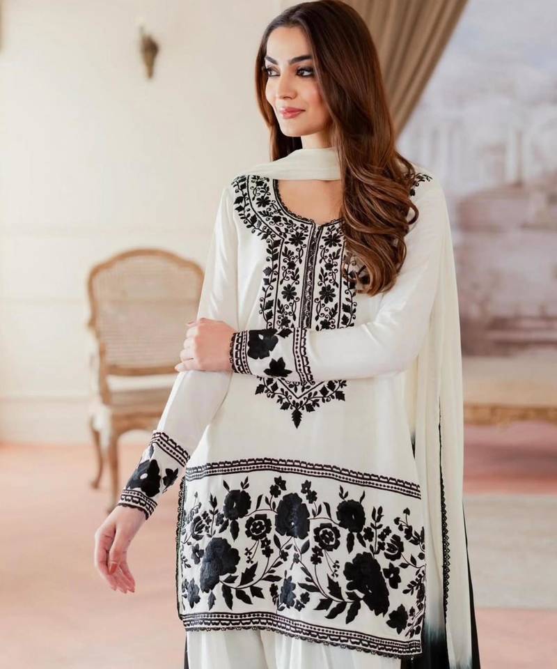 This White Suit Set Features Bold Black Embroidery, Creating A Striking Contrast. Designed With Soft Fabric And A Matching Dupatta, It Offers Both Comfort And Style. Perfect For Casual And Semi Formal Occasions, This Outfit Delivers A Modern Yet Traditional Ethnic Appeal.