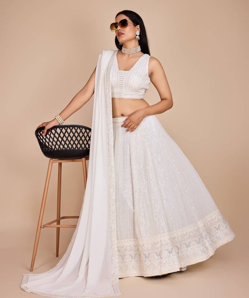 | Product Description | Sophisticated Ivory White Lehenga Set With Delicate Embroidery And Elegant Border Detailing. The Sleeveless Blouse And Lightweight Dupatta Create A Modern Yet Traditional Appearance. Perfect For Receptions, Festive Parties, And Elegant Cultural Occasions. |