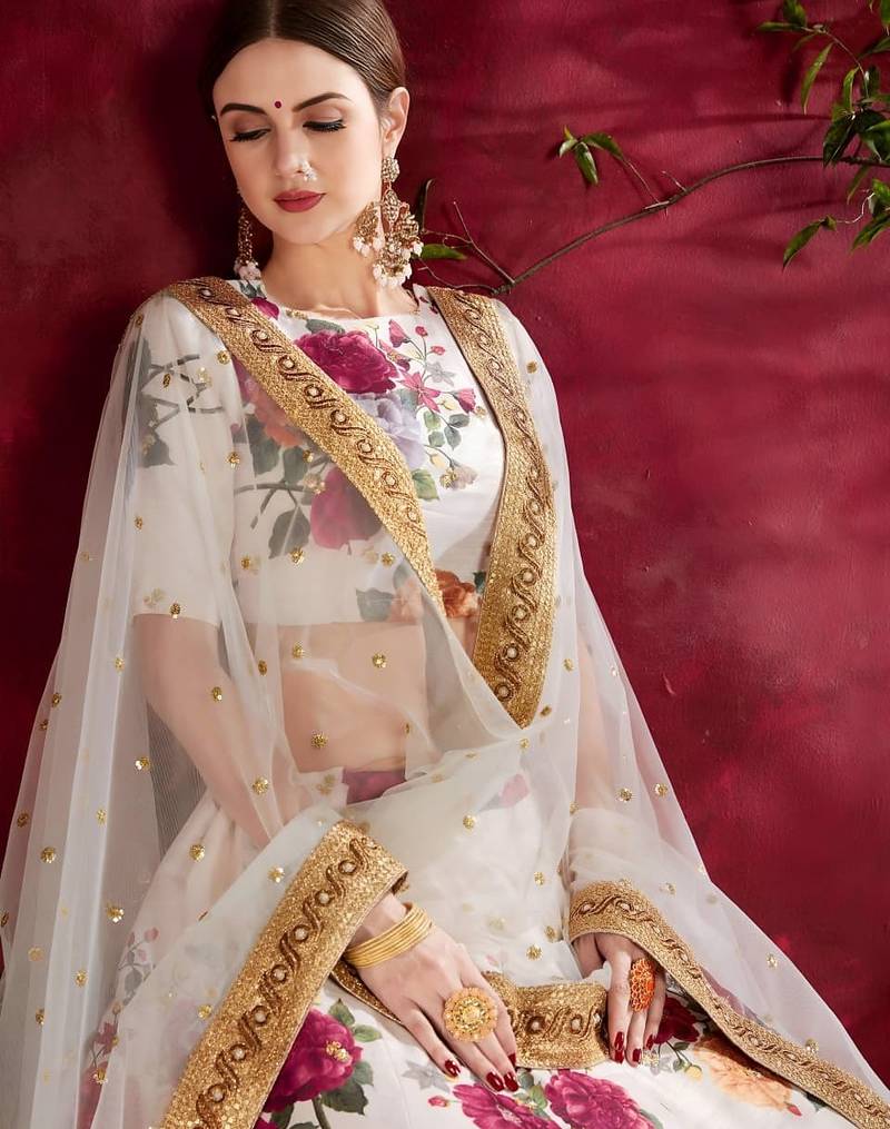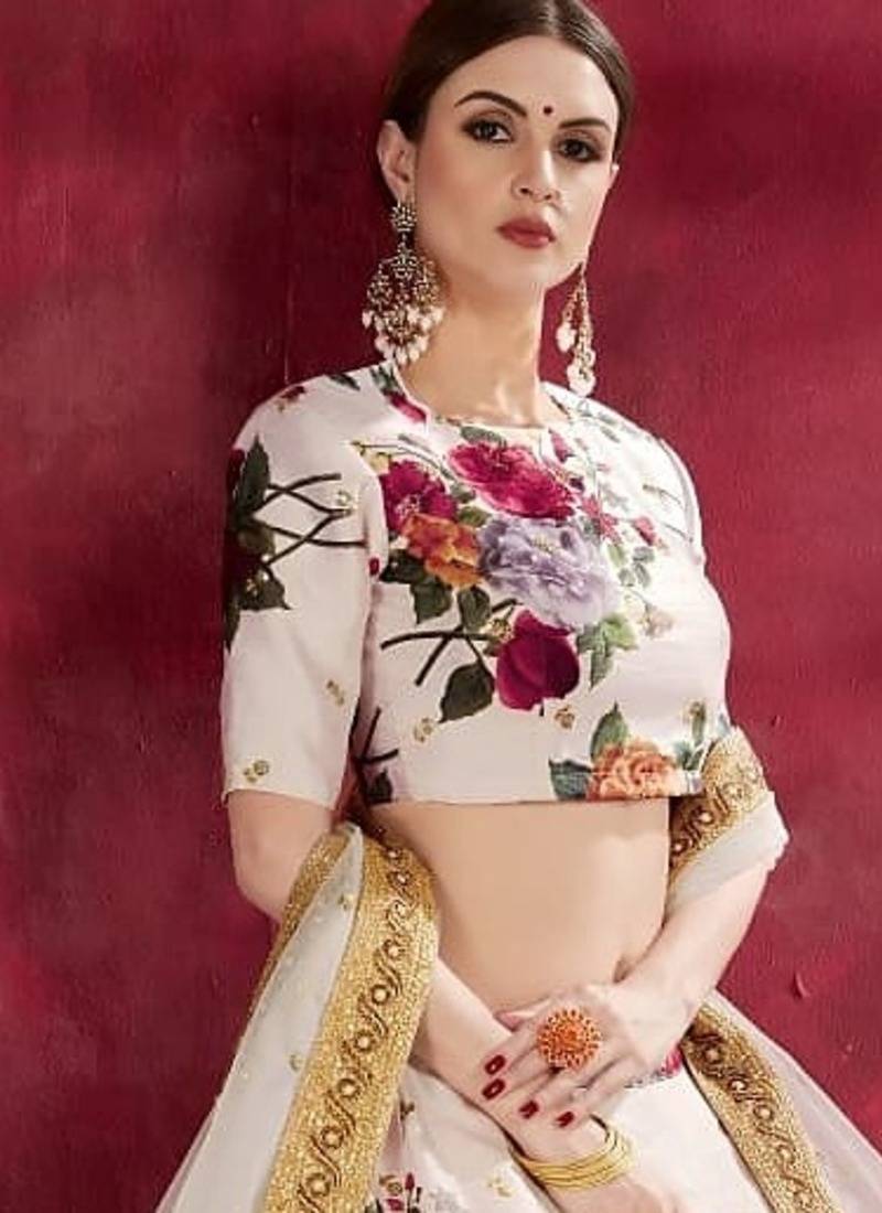 | Product Description | Elegant White Lehenga Decorated With Vibrant Floral Patterns And A Luxurious Golden Border. The Matching Blouse And Sheer Dupatta Enhance The Overall Traditional Look. Perfect For Wedding Functions, Festive Parties, And Elegant Cultural Celebrations. |