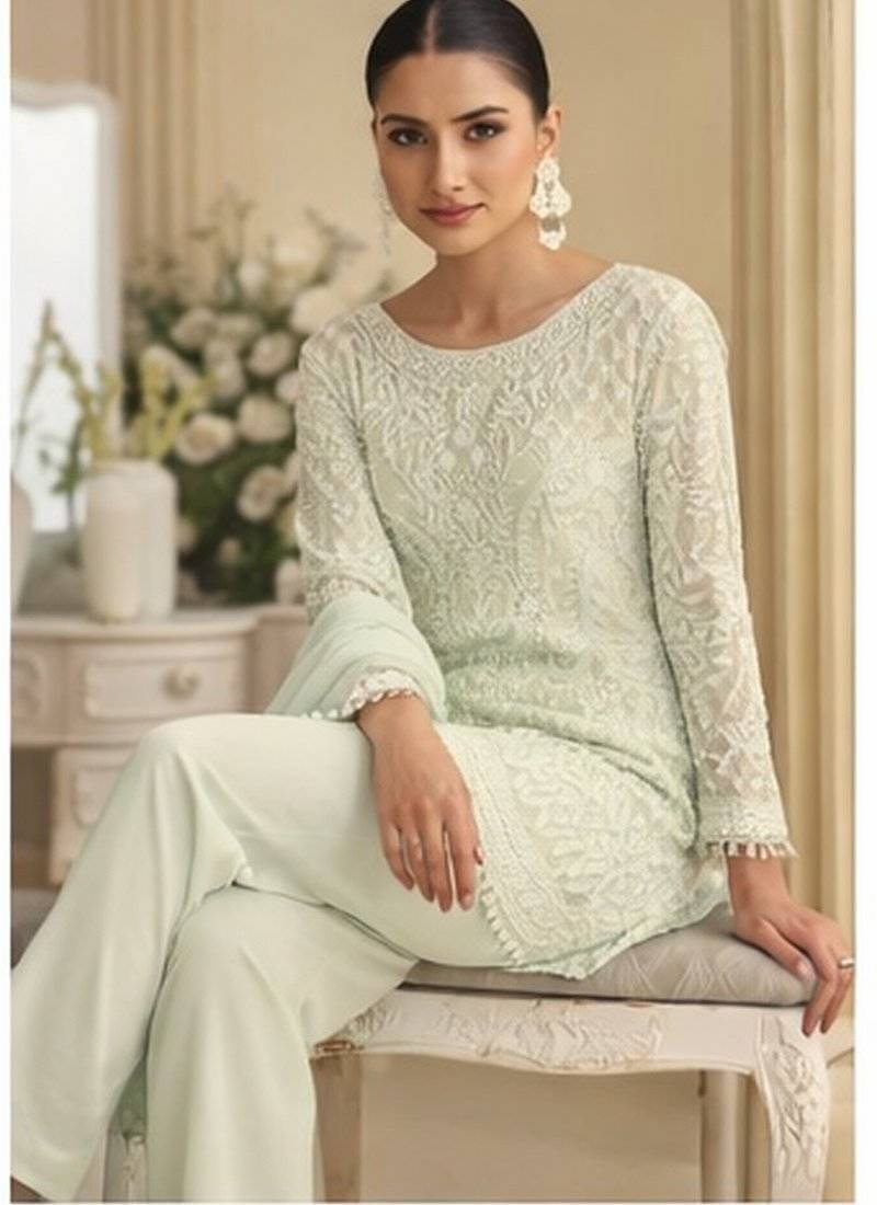 | Product Description | Step Into The Spotlight With This Sophisticated White Palazzo Set. The Long Tunic Is Meticulously Adorned With Ivory White Thread Embroidery And Dainty Pearl Droplets, Creating A Luxurious 3 D Texture. Paired With Flowing Wide Leg Trousers And A Matching Dupatta, This Outfit Blends Mughal Inspired Charm With Modern, High End E Commerce Fashion Trends. |