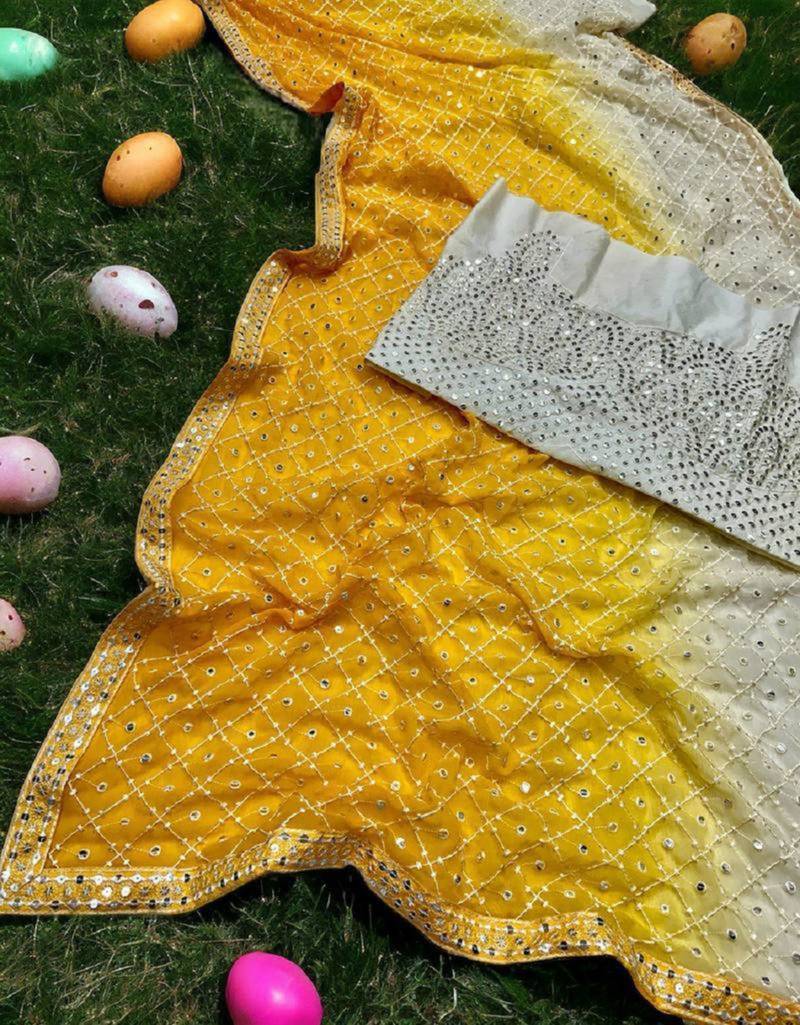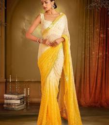 White & yellow mirror work georgette saree