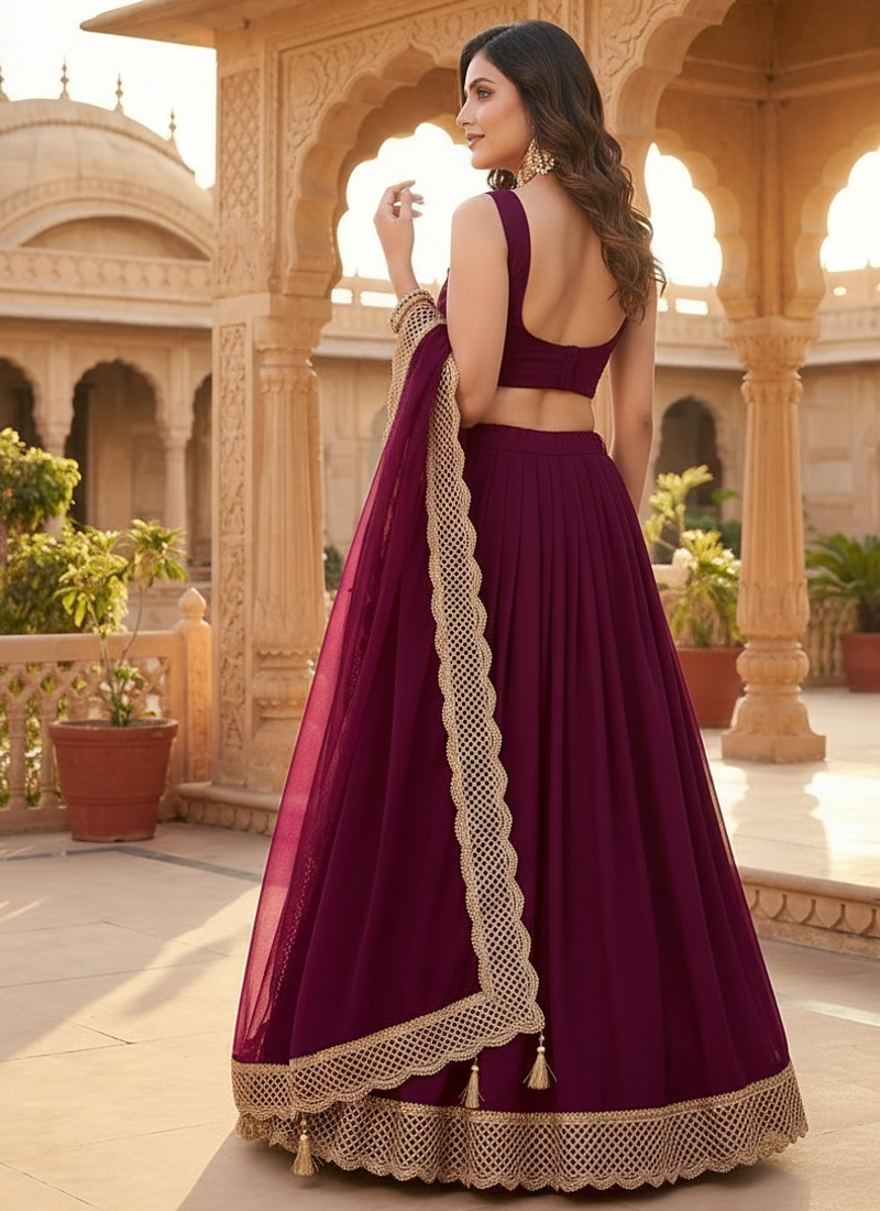 | Product Description | This Wine Purple Lehenga Set Showcases A Sleeveless Blouse, Flared Skirt, And Sheer Dupatta With Intricate Gold Lace Detailing. Designed For Festive Evenings And Wedding Functions, The Rich Color And Elegant Craftsmanship Create A Flattering, Modern Ethnic Look With A Perfect Blend Of Tradition And Style. |