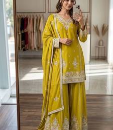 A Cheerful Yellow Ethnic Set Featuring Delicate Multicolor Floral Embroidery. Paired With A Flared Sharara And Dupatta, This Outfit Is Perfect For Haldi Ceremonies, Festive Celebrations, And Daytime Functions.