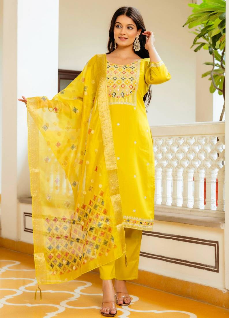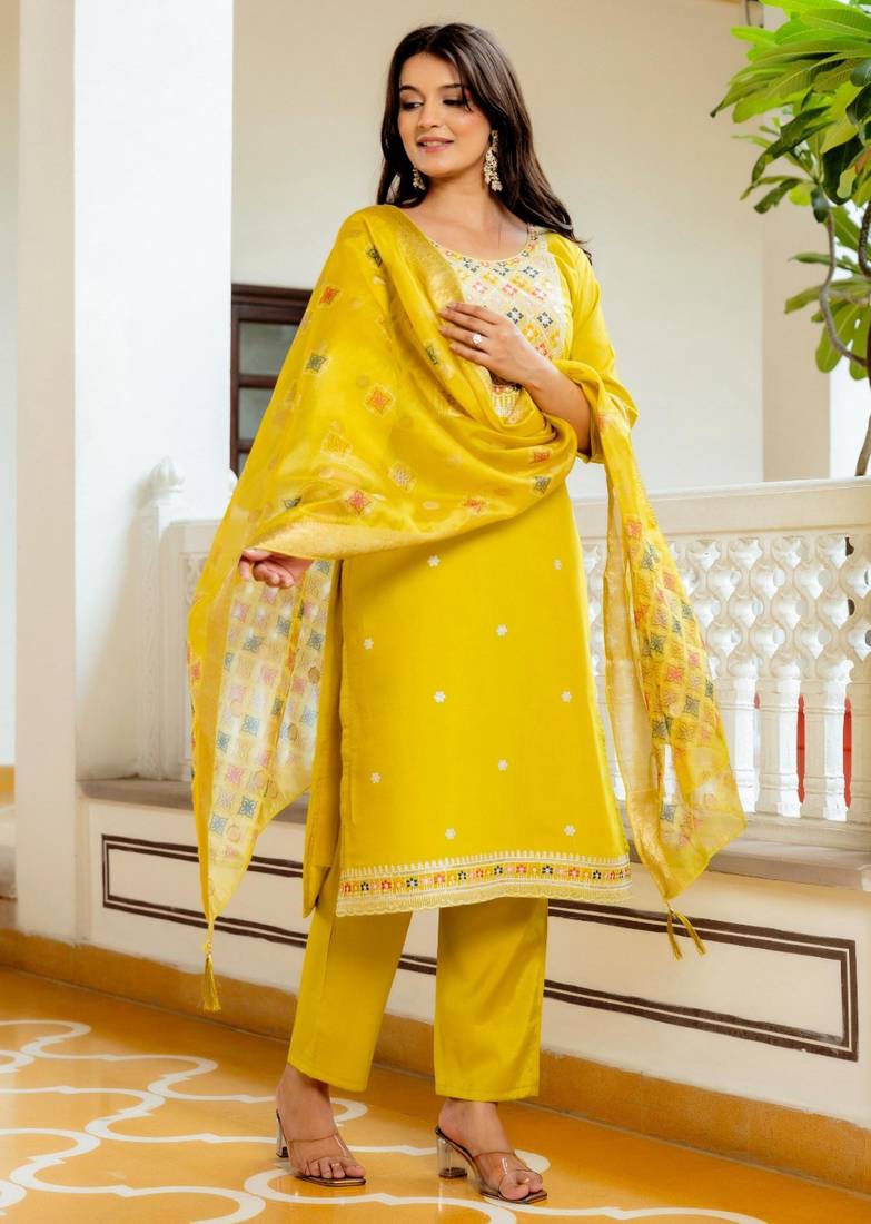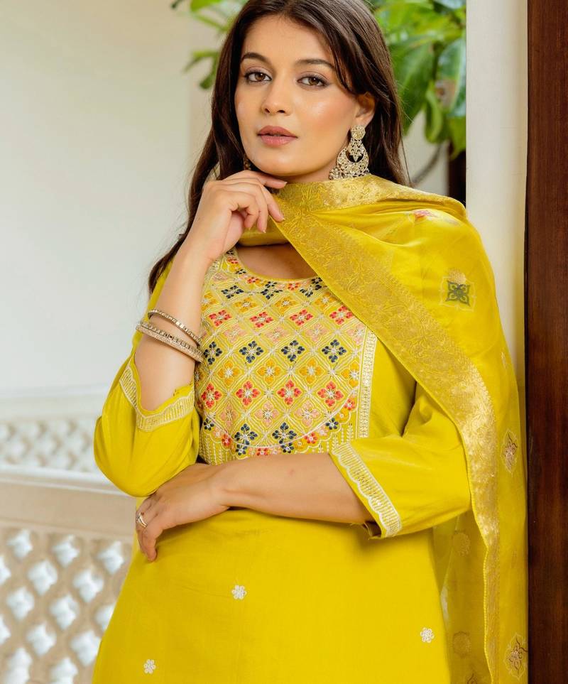 | Product Description | This Sophisticated Yellow Set Combines Rich Color With Artisanal Detail. The Kurta Features Tonal Floral Embroidery At The Hem And Neckline, Providing A Refined, Understated Luxury. Completed With A Sheer, Lightweight Dupatta Adorned With Matching Motifs, This Breathable Silk Ensemble Ensures You Remain Comfortable Without Compromising On High Fashion Ethnic Style. |