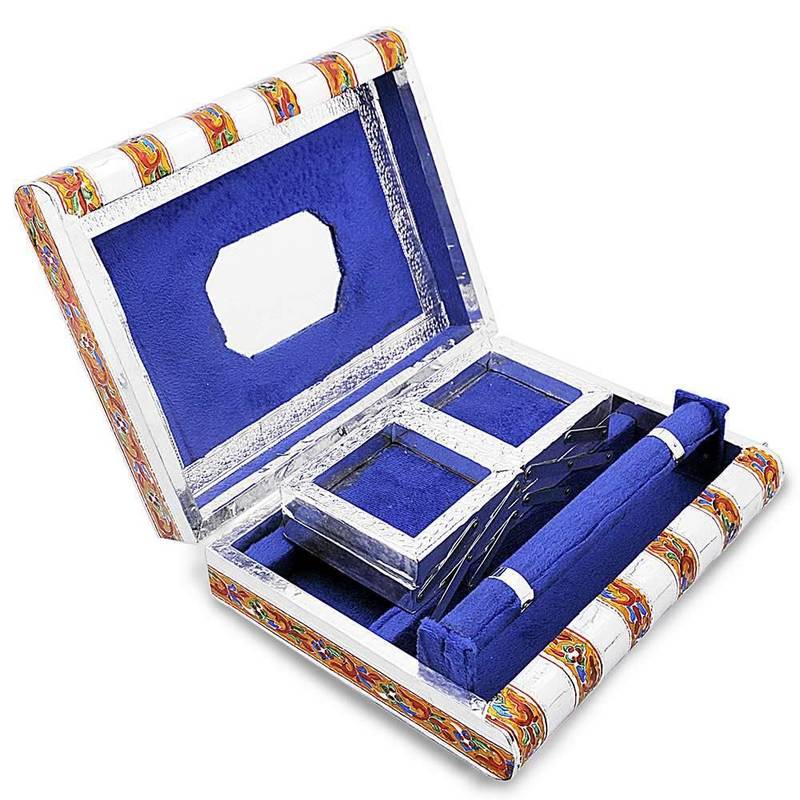 | Product Description | This Handcrafted Meenakari Jewellery Box Is Made Of White Metal And Highlighted With Colourful Meenakari Work All Over. The Inside Of The Box Is Covered With Fine Quality Royal Blue Color Velvet Cloth. There Is A Mirror Fixed Inside To Use While Sporting The Jewellery Pieces. It Has 1 Removable Bangle Stand Wrapped With Velvet Cloth To Hold Around 20 Bangles, 4 Moving Trays In Stair Case Style To Keep And Showcase Your Valuable Jewellery. |