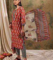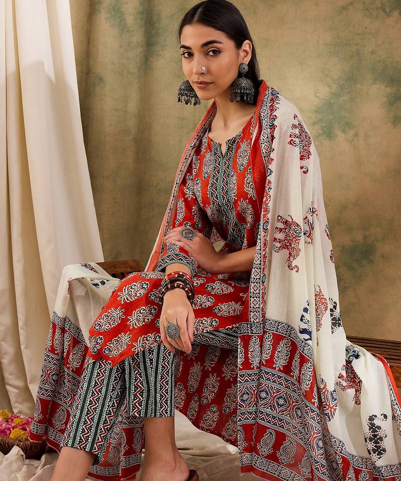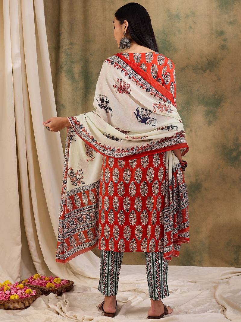 | Product Name | Brown Floral Block Print Cotton Straight Kurta Pant Dupatta Set | |