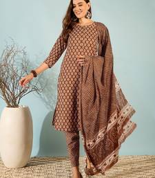 Chocolate floral print cotton straight kurta pant with dupatta set