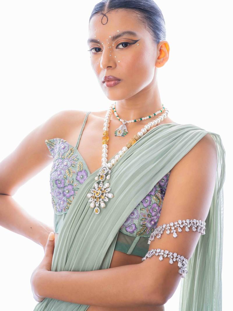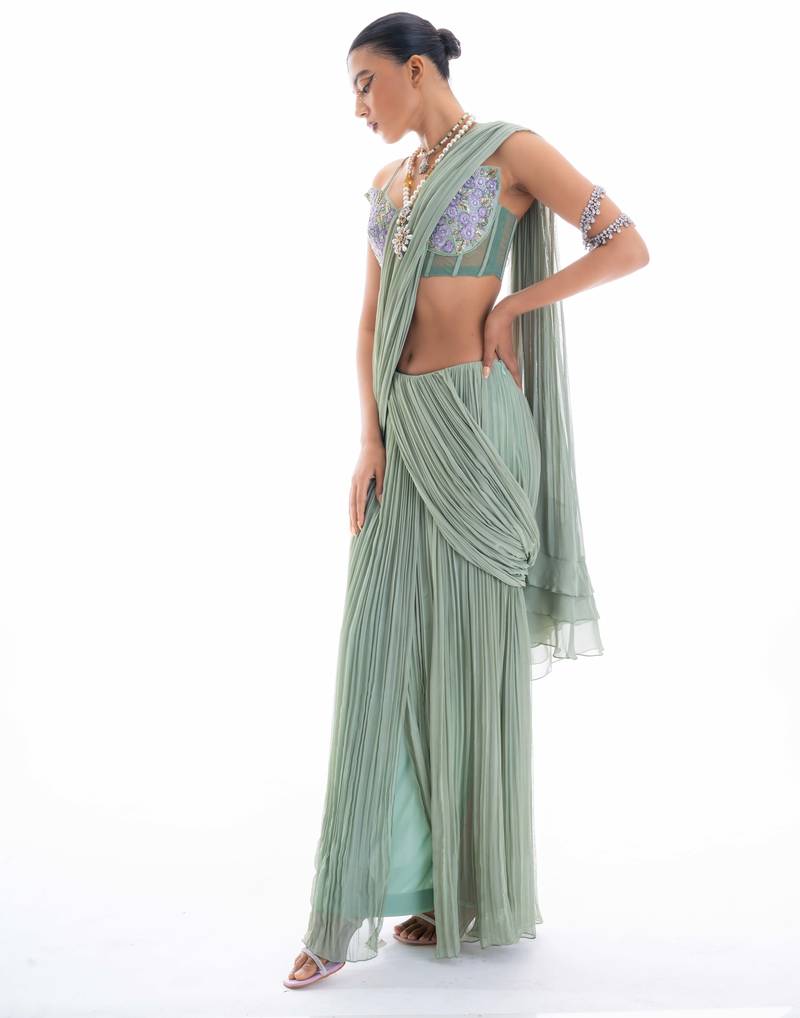 | Product Description | Graceful Sage Green Pre Draped Saree With Stitched Petticoat, Accordion Pleats And Layered Ruffle Pallu. Paired With A Sculpted Butterfly Cut Bustier Embellished With Delicate Floral Embroidery And Beadwork. The Structured Fit And Soft Drapes Blend Elegance With Modern Flair—Ideal For Receptions, Sangeet Nights, Or Glam Soirées. |