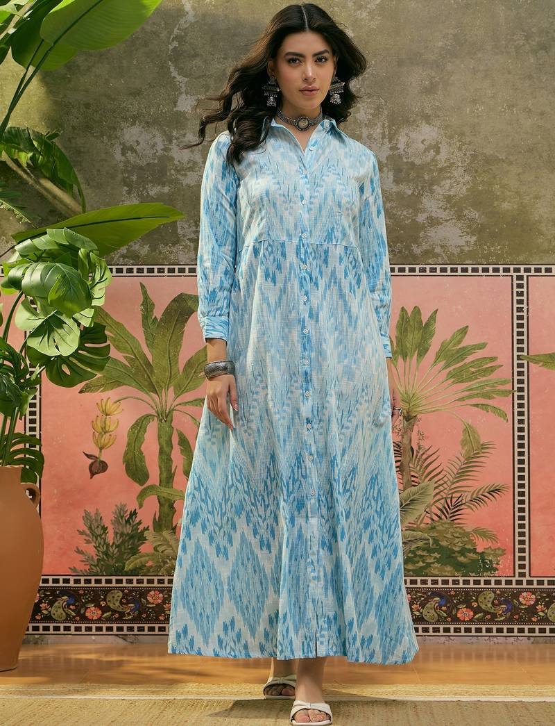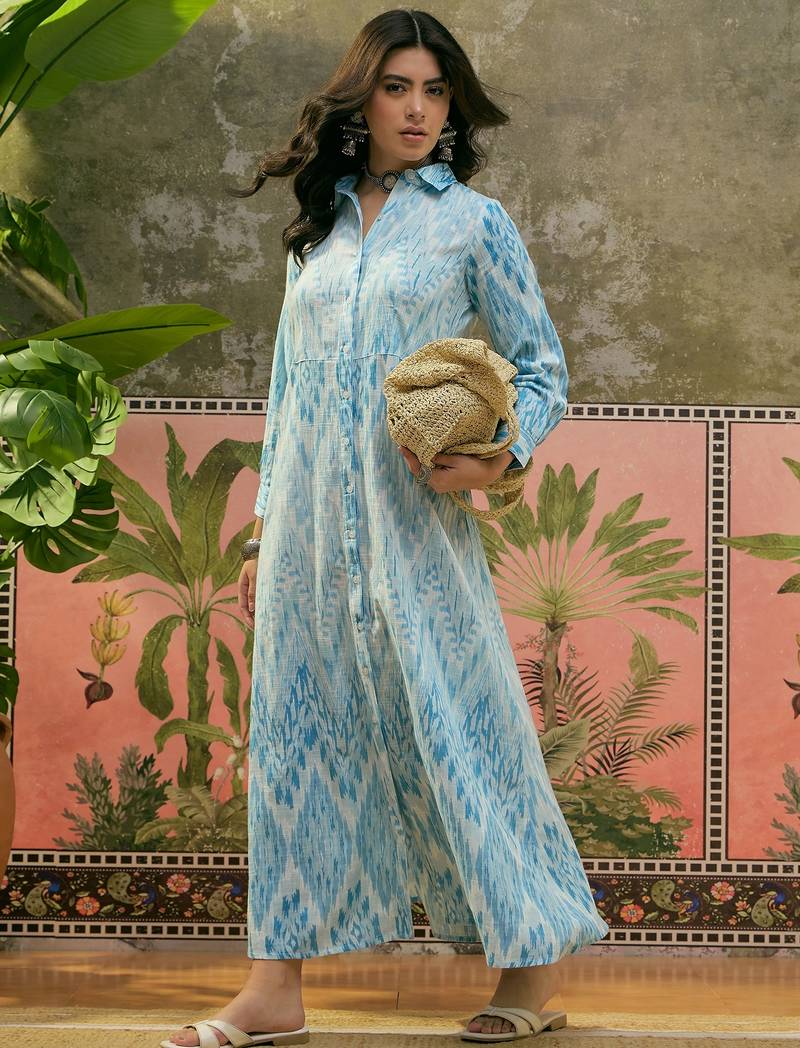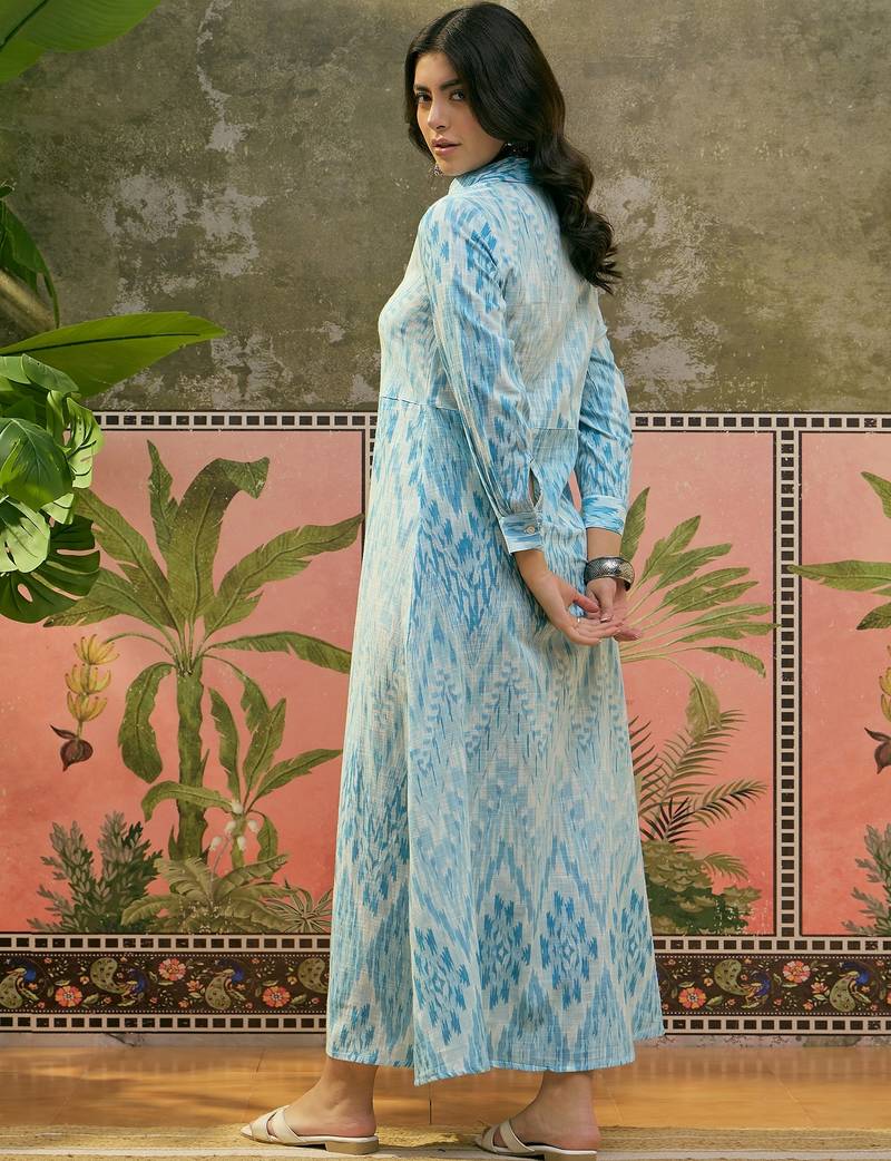 Dynamic Ikat Print: The Dress Features An All Over Abstract Ikat Motif In Shades Of Sky Blue And White, Creating A Sense Of Movement And Modern Artistry.