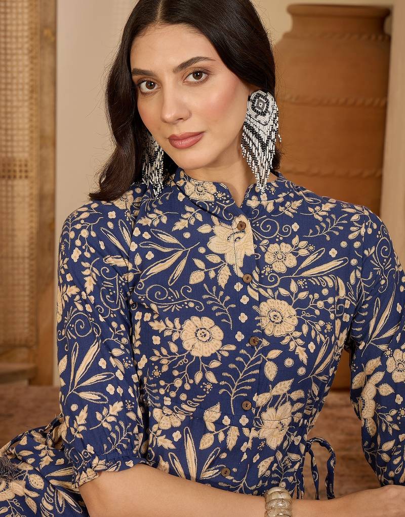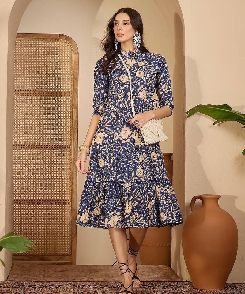 | Product Description | Blue Yellow And Off White Floral Print A Line Dress Mandarin Collar Three Quarter, Puff Sleeve Gathered Or Pleated Detail Midi Length In Flounce Hem Cotton Fabric |